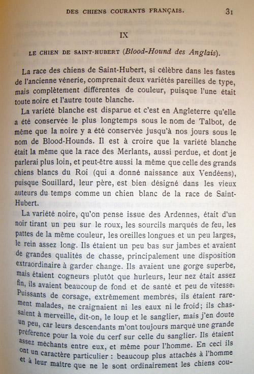 It speaks of 2 breeds of St Hubert, the white (Talbot), which has disappeared, certainly the ancestor of Gascon Saintongeois, and the black (Blood-Hounds) which means purebred, it exists today, but I can tell you that the current Blood-Hound, in general, is less good for hunting because it is not ...