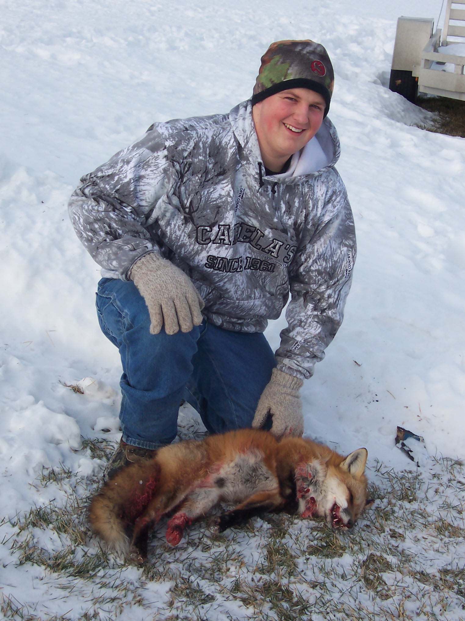 My son just turned 20. The chase was about 2 hours in a big rolling section. The snow was so hard from the rain a couple weeks ago that the dogs were having a tough time. My son was in the middle of the sectionfor 1-1/2 hours in below zero weather. He stated a couple of times that it was cold out there but he warmed up real fast when he started shooting. Never weighed the fox but the tanner said it was one of the biggest he's seen. Good luck to all of you and if we can get a little fresh snow I'll hopefully have some more pics for ya!