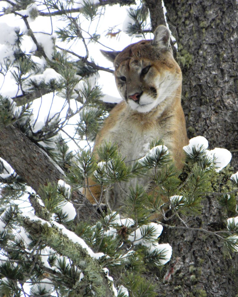 We were having a rough year, lots of miles and no good tracks, finnally today we found a track, was a little old and filled with snow but the dogs struck it and made great chase and put her in the tree, This was a special one for us even though it was a female and we gave her a pass. This was our first Lion with nothing but our dogs. couldn't be happier.