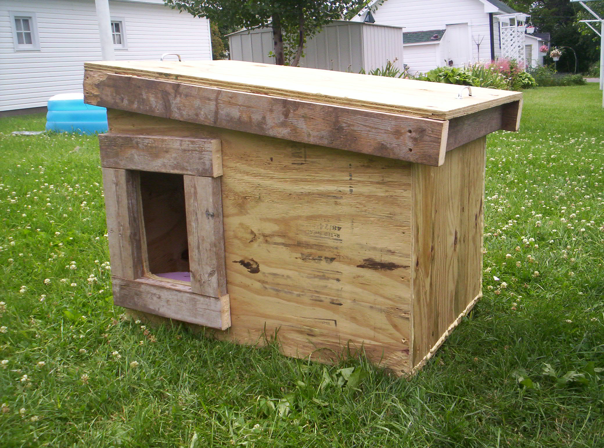 thats the kind of dog house i make but instead of putting the door were you did i like to put it on the side near a corner instead of the end i think it protects them from wind alittle more kind of makes a cubby they can get in and hide.