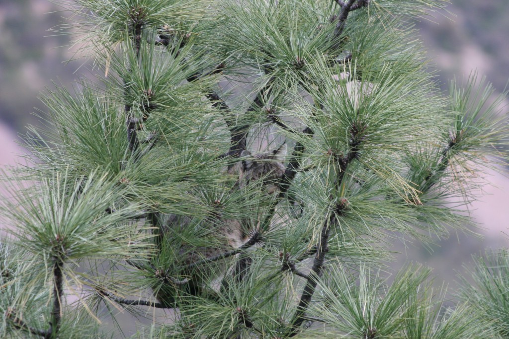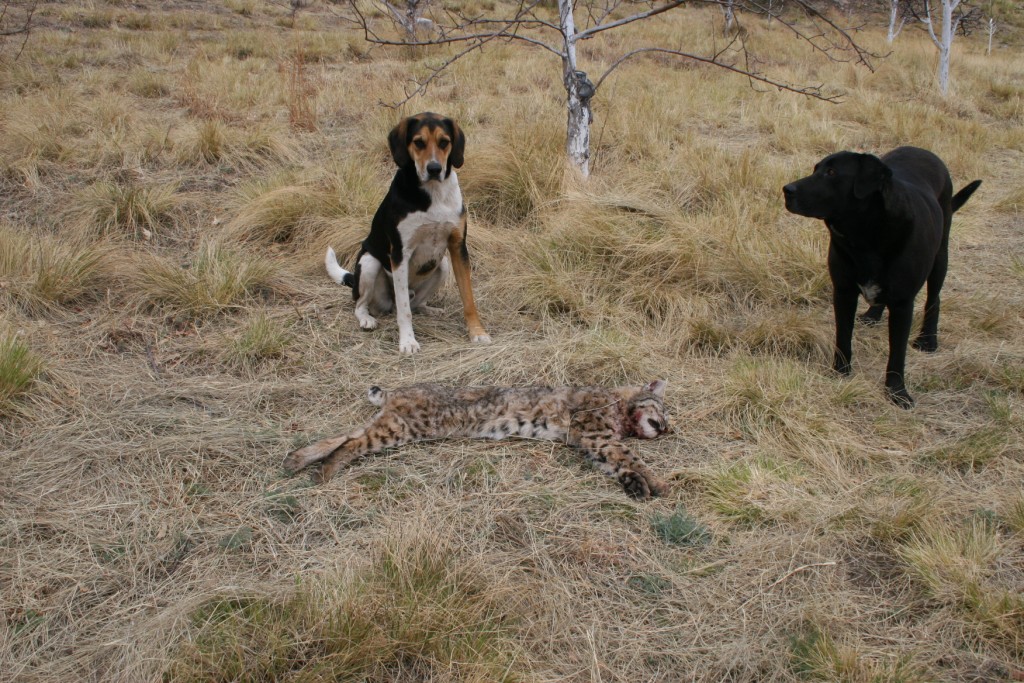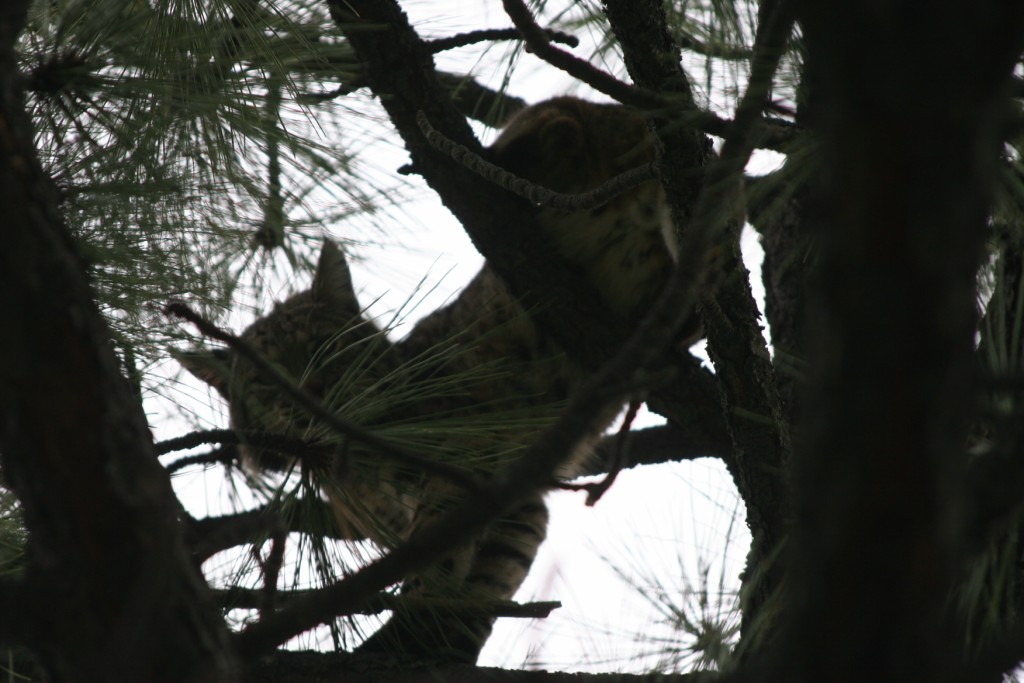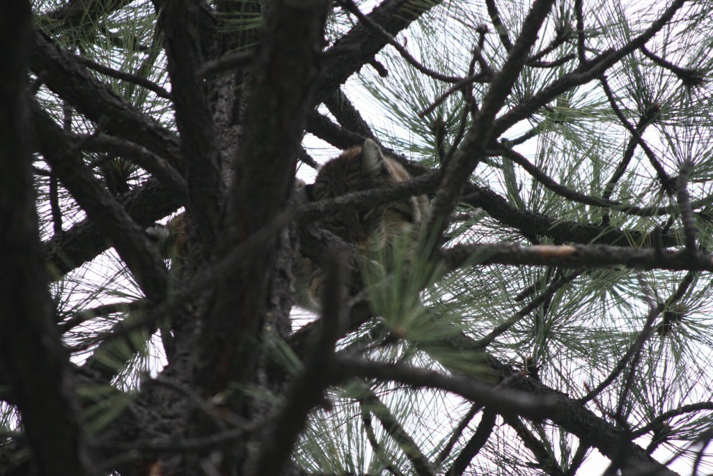 The bobcat was hidden in the brances so I had to get it to move tossing sticks at it didn't work so called the dogs back sat up hill from it where I could see I could see it start to climb back down. As soon as it started to move I let the dogs run back down to the tree.