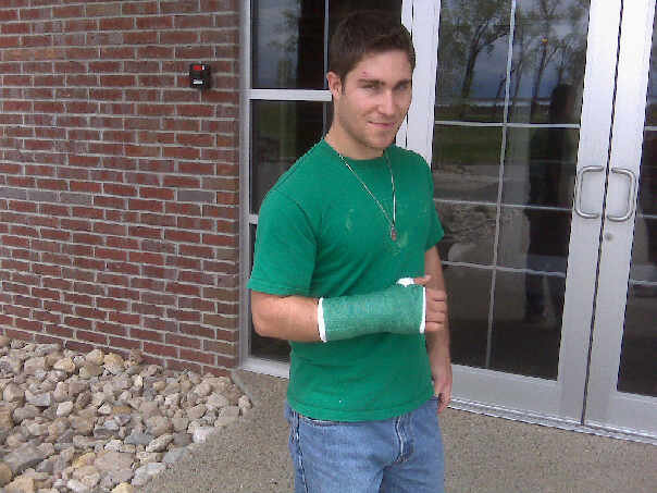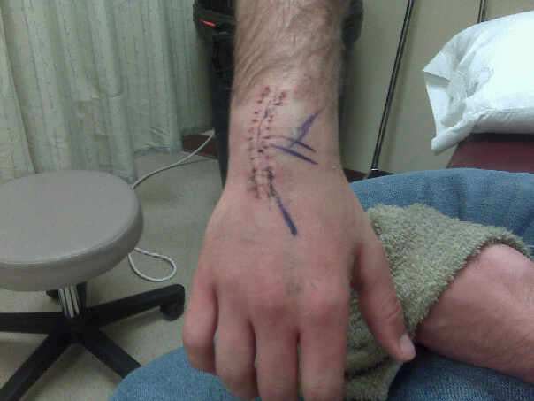 At the ER he received over 20 stitches to his head and a severe dislocation of his wrist (8 places) He is off to surgery this afternoon to repair the wrist.
