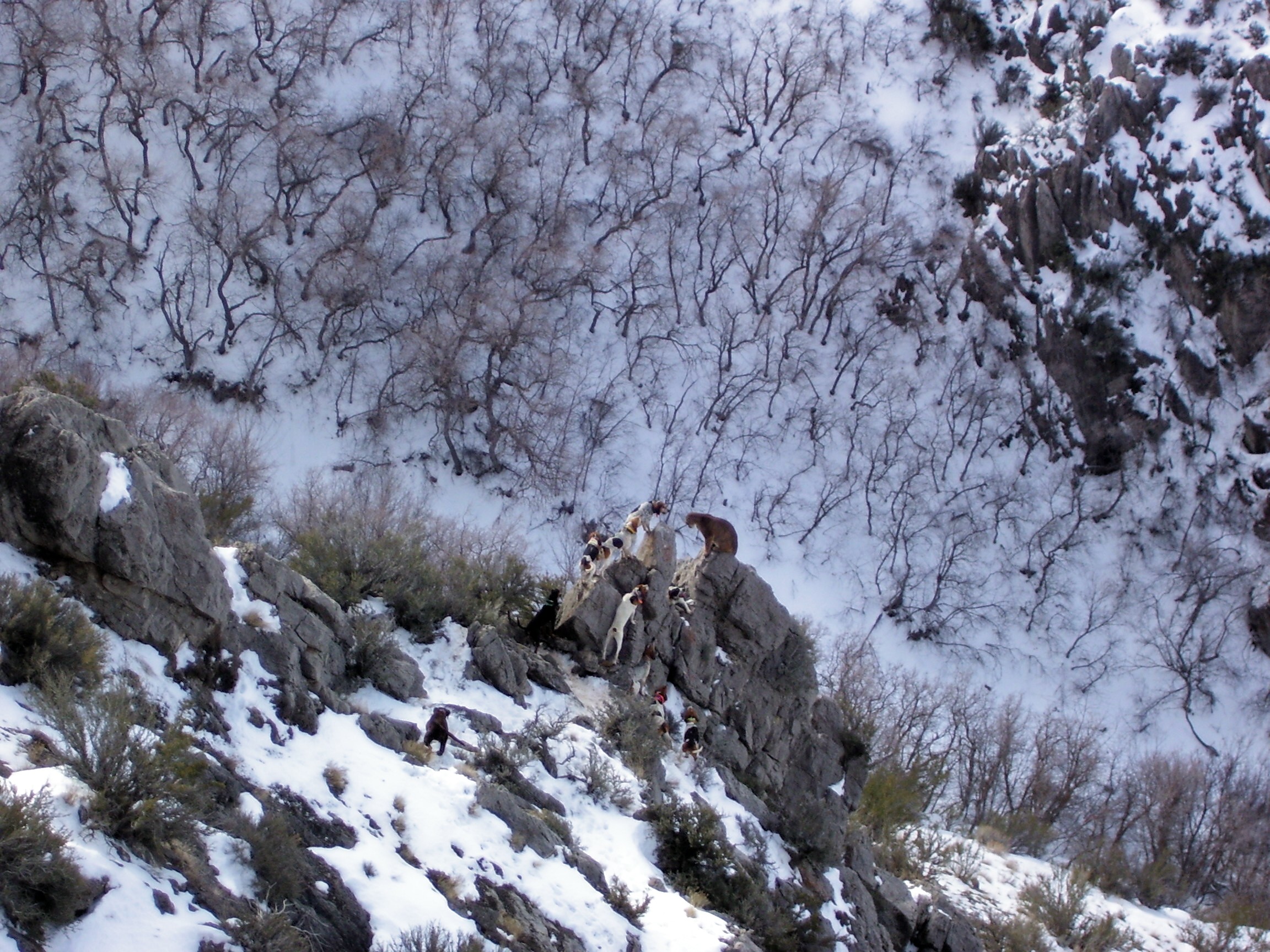 I hunted with a well known lion hunter around here and he runs like 10-15 dogs on lions in the snow. We made a lose and i circled it and found the track. I called for dogs and got to watch a couple good dogs trail up the track and a dozen dogs running down the track cheerleading and not doing anything. But it sure sounded impresive i guess.