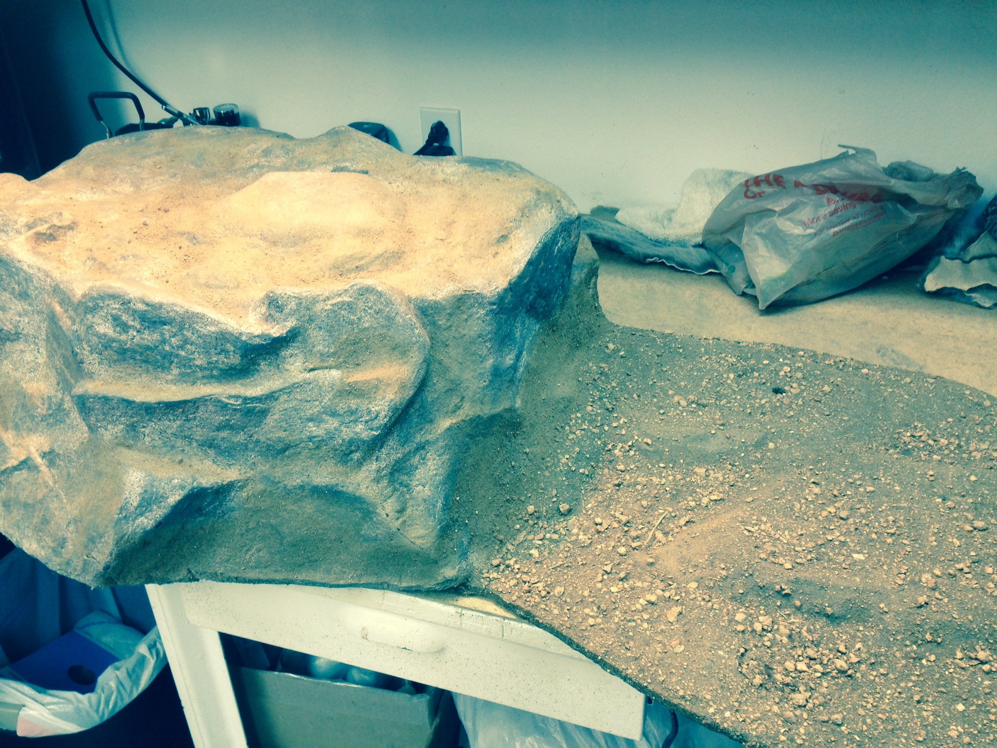 Here’s some before and after pictures. Next step is to finish the base. The rock first gets some filler into the seam areas to hide where the form left small gaps when the foam was poured. Then it gets about 4-5 colors of rock paint.