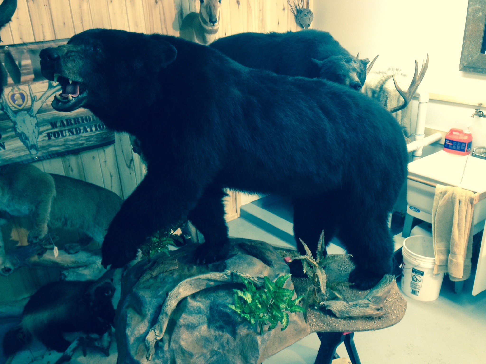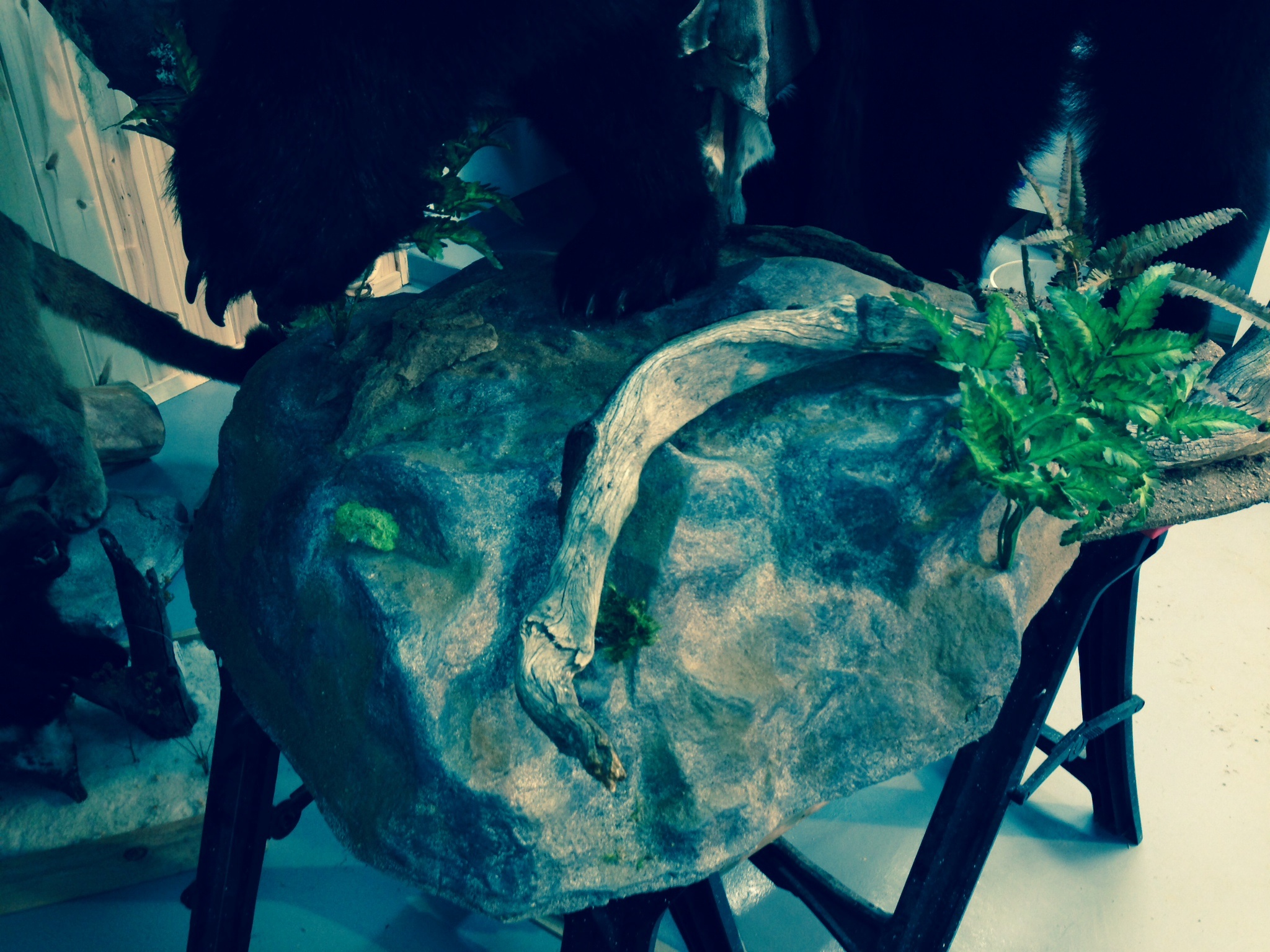I ran down to the local Hobby Lobby and found some suitable plants that would replicate the forest areas in the Pacific Northwest where this bear was taken. I then mounted the bear back onto the base and bolted it down. This allowed me to know where the plants could go without interfering with the mount. I then added some wood to the base that I collect and keep on hand for just this type of base and then added the plants. The mount is complete.