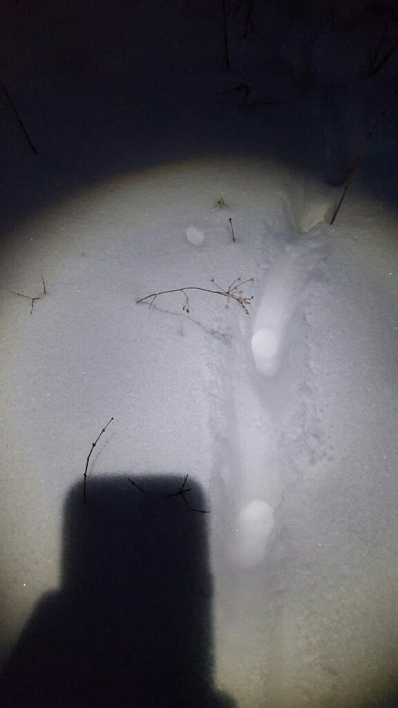 Found this big tom track with some snow in it. Was a tough cold trail. Temperature in the single digits and Snowing heavily. About a mile race but took a couple hours. The cat skirted several traps luckily I only got one dog trapped. He didn't run popped right up on the jump. I had forgotten my scales that morning was hunting with Phil Soucy, and he wanted to use parts of it for taxidermy molds and he knew a guy with a certified scales, so he took the cat home to skin etc. His buddy with the the certified scale can only weigh to 30 lb. Phil weighed it on a digital scale and got 36 & 35 lb out of it, he took a video of weighing it has so far be unable to send it to me. I told him to go ahead and skin it and not worry about trying to find a bigger certified scale. I know to win the prize I need a certified weight but my understanding is the pot is currently pretty small so I have no problem forgoing the prize or the title of being the winner.