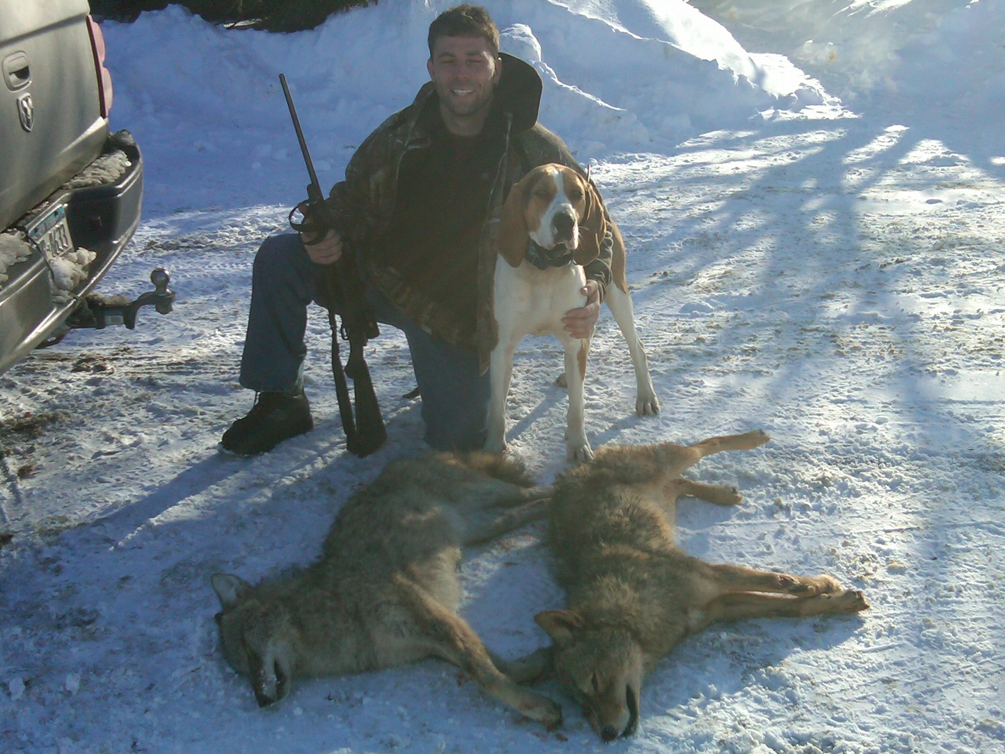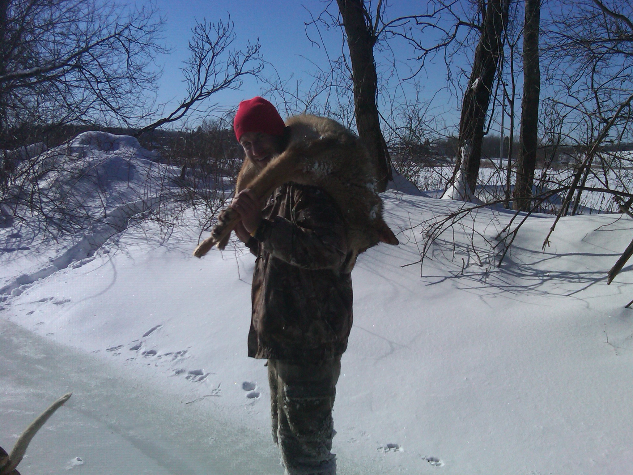 Well the day started out like it was going to be a rough one. lost my back tire hitting a pot hole and the lugs and studs snapped off. So I had to leave my truck right there and loaded the dogs in my buddys truck and off we went again. Shot the first one fast in front of the dogs game over. Found another track and dropped the dogs again. Well this big male did not want to die. We ran him through swamps, into town, through restraunt parking lots. Back down in the swamp down a creek. Back into town. Had to trail him myself in waist deep snow for an hour without the dogs because of the town. Finally we could turn the pups out again and they caught him in a brush pile an hour later. I couldnt get any bay up picks because the dogs were so far in the brush pile we had to dig a hole to get in to kill the coyote. Man I will tell ya what the coyote lost but not by much. The two pups got chewed up pretty good. If you look at the picture of the red colored coyote you will see his front leg is worn down to the meat. We ran this coyote last week when the crust was on and he won after about seven hours. At least he didnt win today. Good luck. Rik