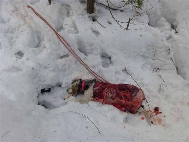Just a note to let you guys know that we had three dogs killed by wolves less than two miles outside of Libby on Saturday the 2nd. We cold trailed a tom all morning thinking the track was fresher than it was. It went towards the wilderness and when it came back we followed it on sleds for over a mile. At this point we had caught the dogs and thought it was pretty hot by the way they were rolling. It was three o'clock and we were staring into a big nasty drainage with restricted access on the other side. Five wolves had come out the day before and had moved south so we took a chance that we soon would regret. They rolled down into the bottom and we waited to hear the tree. They started to climb up,up over the top of the next ridge. At this point we split up. Todd, Scott, Ryker and Clyde sledded to the house and hopped in my truck and rushed through town to try to get to the dogs. John and I went back to load our sleds and meet the other guys at the gated road. I shuttled guys in and they started snowshoeing in to the dogs. They were spread out in a triangle pattern about 400 to 500 yards apart. The snow was deep and steep climbing made it a tough go. When Todd called me right at dark I was worried because the dogs were not moving and we never heard them bark since we left the other side at three o'clock.