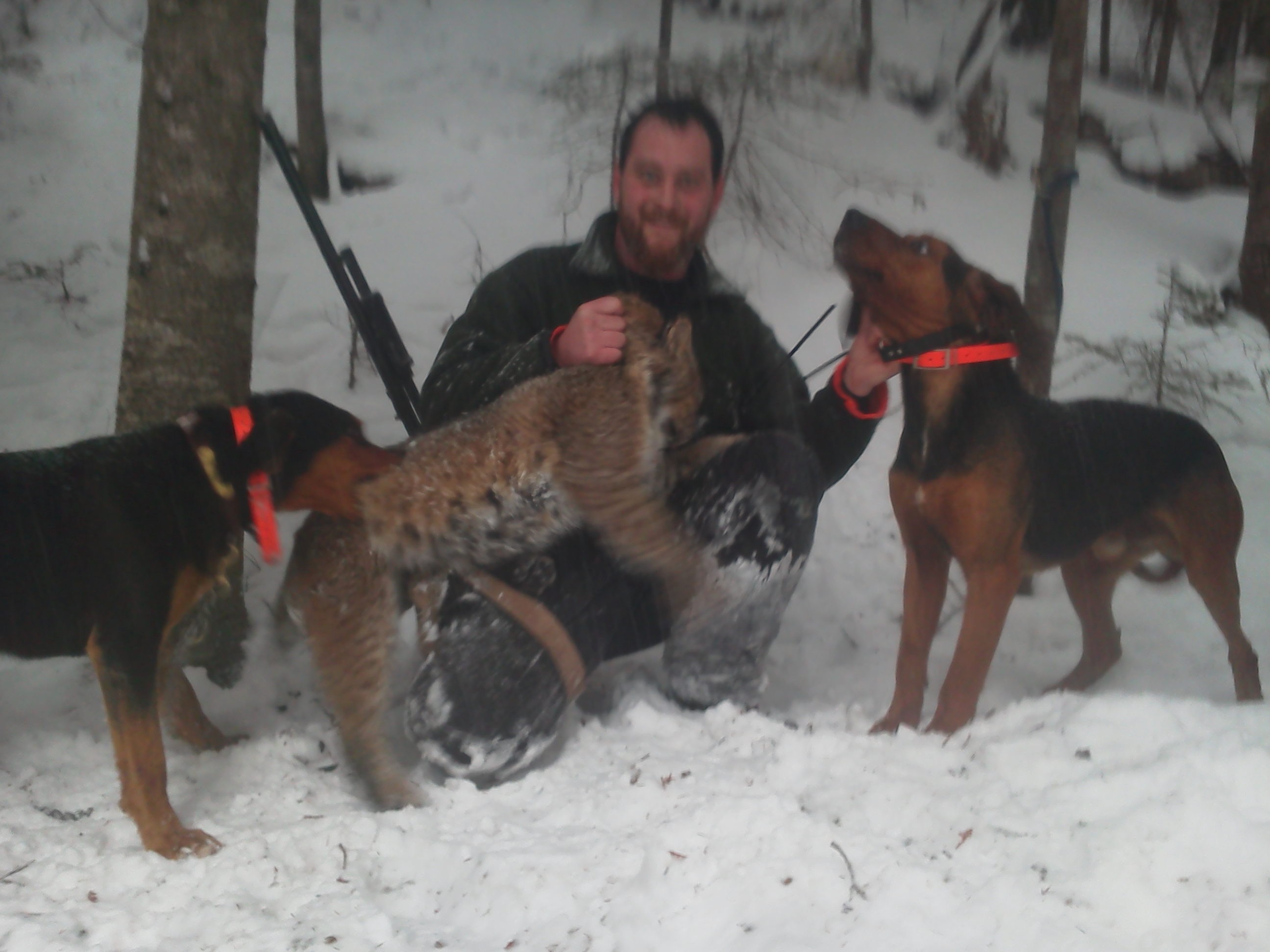Here a little reading for your eyes. My last cat of the year went like this. I started the day out with Drum my cat dog and a young red dog buck. Riding along checking tracks like a mad man down one rd nothing off to the next one we go we pull in and I see that it is plowed which is normal for the people to get into there camps. as I get to the first turn I see its not plowed go down the road 75 yards cut a nice big tom cat track from last night. So I grab Drum out and put him down off he goes so I go back where I just came from and he makes a lost after about 250 yards. This time the cat had walked into a deer trail and stayed in it for 30 yards or so. I got drum back on to it and off he went southwest after a road and the snowmobile trail he come out to the next road made another lost at the road he went right when he should have went left so I get him back on it and off he goes right towards a house that feeds deer and route 27 so I go over there and ask the people permission to go on there land and see what he is doing and again another lost in a deer yard back to searching again this happened again about an hour later 600 yards down the river. so at this time im 2.5 miles from the truck with no gun no radio no cell phone just me and a young dog. so I go back to the truck and see that my partner Timmy called so I called him back and he said he was in the area and had drums brother jack with him and actually drove right by me so I told him where I was and that it was a nice big cat and that I was coming back over to figure out where it went and to cut back on to it. So we met up by where the final lost was made and what we found was amazing we was less then 75 yards from a persons house and see where the cat had a deer kill. You could actually see the deer kill from the houses kitchen sink. So I go with drum and figure everything back out and off he goes back to the river so I head down the river to cut drum off and give timmy a chance to get back with jack so we can really hammer it out. so when timmy gets there off they go they made a lost again on the road about 800 yards out and that was the last lost they made 3/4 of a mile later they had the cat caught and bayed up against a steep banking as we walked in the cat ran off 10 yards turned around and came right back the way he came from and that is when we humanly harvested this Nice 38 lb beauty.