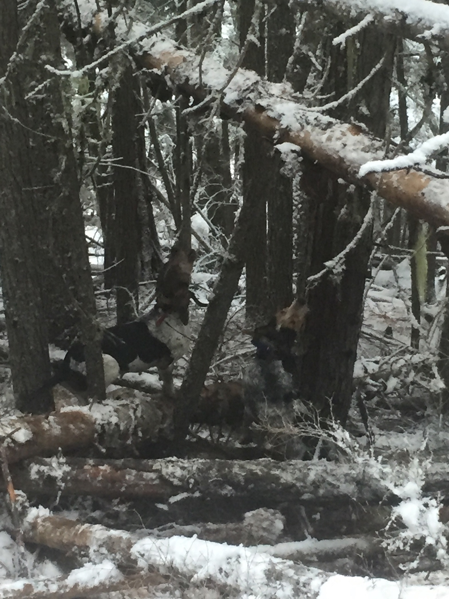 Race #4 turned loose Buster, Ranger, & Diamond on a snowed in track. Took an hour to get to move it 600 yards. Jumped it 300 yards above the road, I was standing on the road and the bobcat almost ran over me (dogs were 30' feet behind). Ran 200 yards below the road took a sharp corner going another 50 yards and treed.