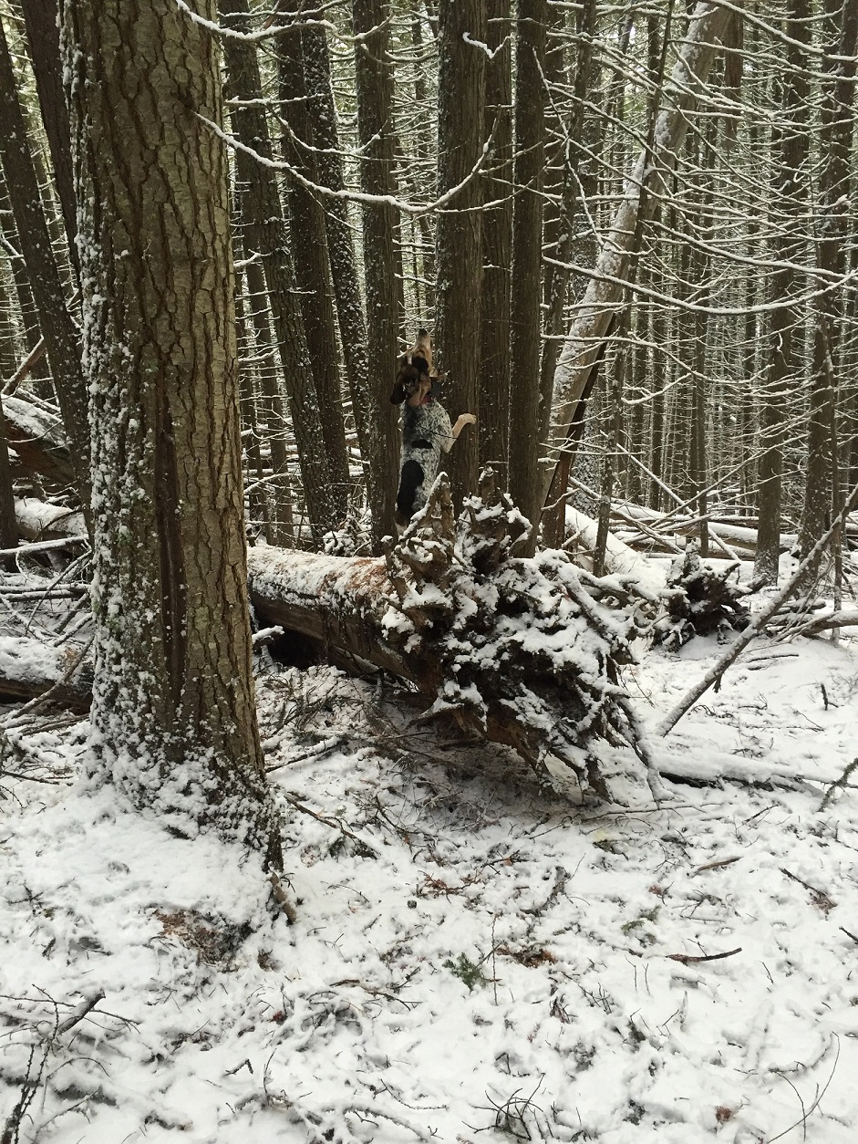 Race #6 found a hour old track, turned in June & Ranger friend turned a dog in. Jumped it 50 yards above the road after a 400 yard fast cold trail. Crossed the road and line drove it 400 yards parrale to the road about 100 yards below the road & treed it.