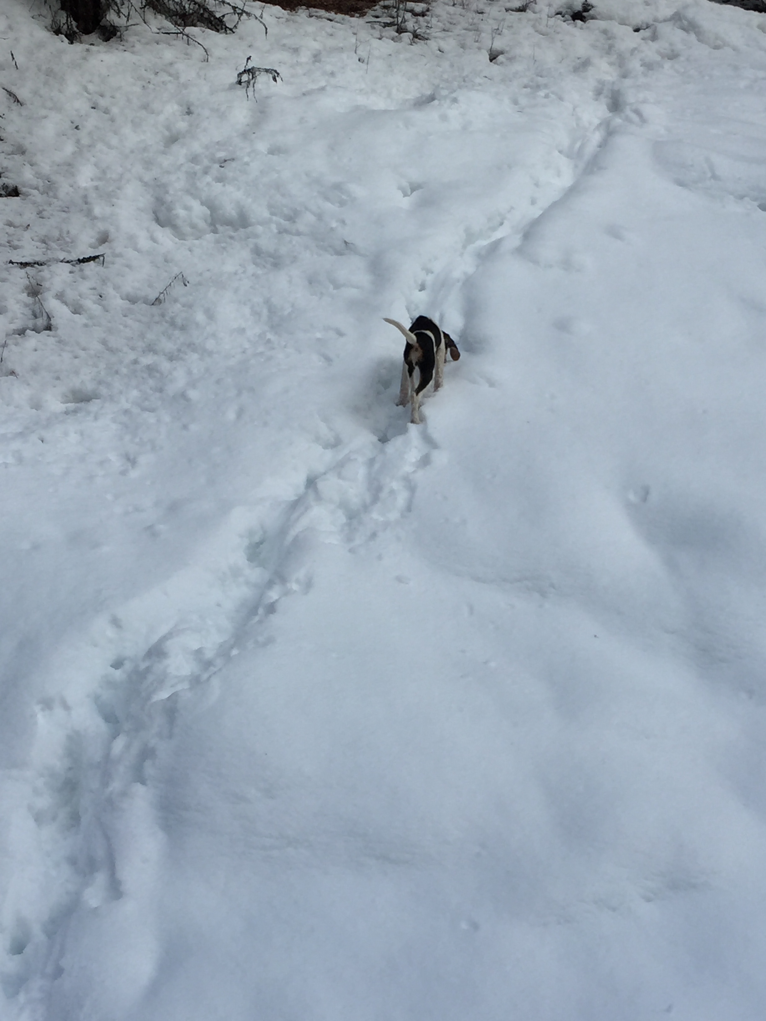 He has only hunted snow twice, and both times displayed that his habits/style did not work at all in that snow that day. I could describe it, but it was painful enough to watch the first time without re-living it. In short, given the scenting and snow and non-target tracking conditions, to progress uninterrupted, he really needed to put his nose in most of the tracks, and this was just below his dignity. I think he would figure it out, but I might never have him in snow again. (So I can pretend he would figure it out)