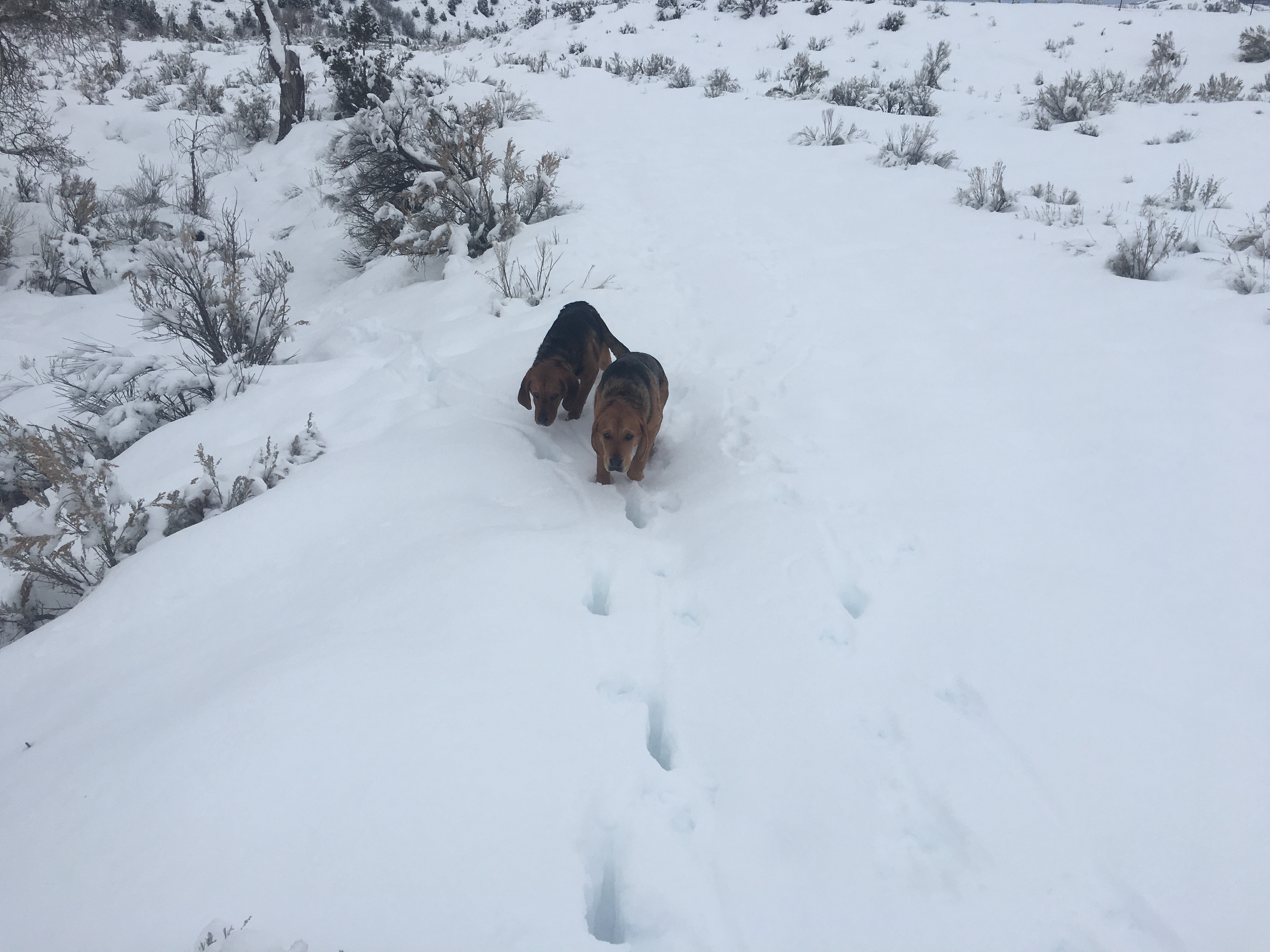 Pups are doing great finally able to get them on some tracks this weekend. They took the one bobcat track really well, it went through a mess of turkeys and chased a couple rabbits. After a few losses they were able to figure it out and trailed it for about 1000 yards through some deep deep snow and a creek bottom they lost it at the highway and this is were I was informed that I was not on the property that I thought I was suppose to be on so we called it a morning. But they did awesome.