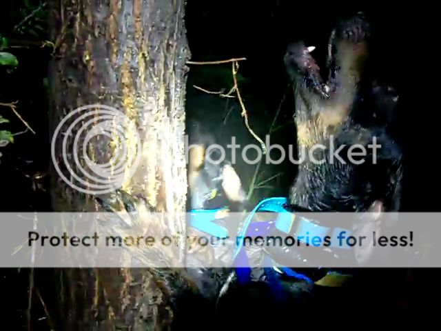 last nite time runs with joe didnt get nothing going and was pissed so hit it early this morn. first drop he hunted good with nothing, second drop he got struck on bad track and worked dang hard stalling out near fallen tree going into huge den. was well after daylite and after going in and watching him work grabbed him and ran and got trix and shadow. dumped them in there but they all went through on other side of creek and got a race going way deep. got a phone call from bud with car troubles so never heard any of race but dogs got way deep and ended up treed and i thought was on a known den but was in ground hole near the known den. got in there and dogs were silent but come out of hole and im sure killed coon. joe got bit in leg and had to treat him this afternoon.