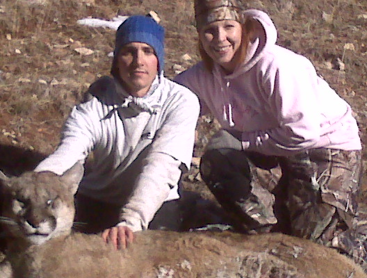 Well, went out Monday to go look for a lion we knew about on one of the private ranches I hunt here and just happened to turn my phone on and got a voicemail saying my sweetie never made it home the night before while traveling back to Ten Sleep from Kaycee on the back roads over the mountain. The lion hunting was put on hold to go look for John. We found his Jeep stuck on one of the roads there (his 4x4 went out) We got him put and headed back to Kaycee. As we were headed back we crossed a lion track from the night before. Since we had the dogs with us we decided to run the lion. John had a tag the last couple months and has been hunting with me since we got together. He is also my partner in my hound business and a fellow hunting guide. We dropped Ozzy and a dog a friend who was with us had. They took the track up and over a ridge and kept going. This was about 11:30 in the morning. We thought it would be a quick run, but oh no. This cat had been hunting all night and was all over the place zig zagging from ridge to ridge and down in a canyon. My friend had the Garmin collars and we saw the dogs were covering some major ground, but working slow on the burnt off south slopes. We kept walking into them and they kept moving in circles and all over the canyon. A few times we thought they were ledged up and trying to find a way out. As we walked into them in the bottom of the canyon John found a very fresh kill. A young cow elk. The dogs were barking not too far from us, but since the trees were thick in the area it took awhile to find the lion in the tree. We looked the lion over and decided it was a good cat. It had its rear end to the tree and was looking down at us. I questioned the sex on it as I couldn't see beneath the tail. It had a pretty face like a female, but the size of the cat, the big round head and track made me wonder if it was just a beautiful faced tom. John decided he wanted to take it. He shot and it eventually jumped tree and the race was on again. It ran a ways and treed again. John couldn't get a good clean shot from the bottom of the tree so he climbed the lodge pole next to the lion tree and made a clean kill shot. The lion died in the tree and he had to once again climb up another tree to get the cat out. It ended up being a very big female. The biggest I have ever seen. We are estamating 140 pounds and taped 7 ft on the carcass. She had an empty stomach as she had not eaten any of the elk she had just killed. We looked on the Garmin and noticed we were 3 miles from where we had dropped the dogs, but it said the dogs had ran over 12 miles on the track. Ozzy and Freckles did an awesome job and my sweetie earned that cat. He is now addicted to lion hunting and said from now on he wants to climb trees to take up close and personal pictures of them.