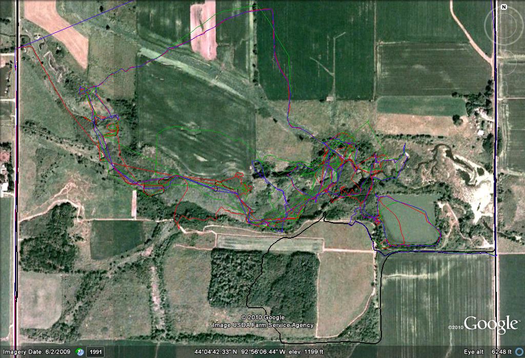 We finally got out for the first time this season plus it was our first time using the Garmin Astro. Nobody has been seeing much of any tracks for days. Today was the same, there wasn’t a coyote track to be found. So we dumped our dogs in a section that always hold yotes. But the coyotes are known to circle in the thick brush. It seems that unless there is enough dog pressure they don’t come out of the thick stuff. I was worried because our dogs are good and out of shape and I knew they would get tired quick and probably not be able to push the coyote hard enough to get it out of the section. Sure enough we spent the better part of the day trying to catch the dogs as they went around and around. I put the dogs tracks on google earth. According to the Astro, Minnie (green) put on 6 miles, Copper (blue) 9 miles and old Hub Cap (red) put on 14 miles in this tiny area. That’s not counting the distance traveled in the truck. As you can see in the image, they never left the middle of this one mile wide section. We even had another guy dump some fresh but young dogs but they couldn’t get the yote rounded up or kicked out either. We were happy to just get the dogs caught up. They were dead tired and needed a break. Once the season goes on and they get in shape, they shouldn’t get nearly as tired in this distance.