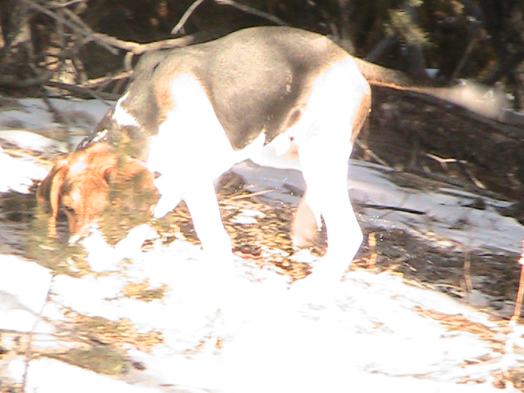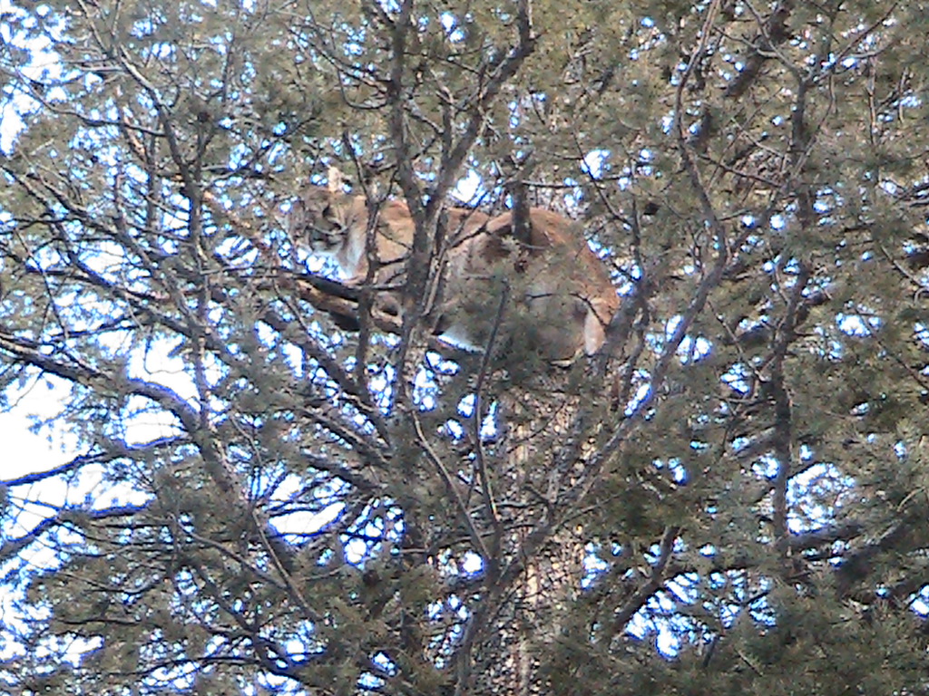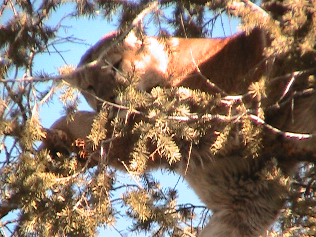 I cut his track at about a hour befor daylight so I did some driving around after wiping out the tracks in an atempt to shorten the track up. I ran a road that was on the next ridge top about 2 miles away and the track didnt cross so I was sure he was in the drainage between. At sun up I turned the dogs to the track. They didnt start it great and I couldnt find the track because when it left the road it went into burned off stuff, but after a little work the dogs got the track going and once they hit the bottom of the drainage they were smoking the track as there was more snow in the bottom and on the north slope. After working the track for a few miles down the creek they blew up and I could tell they had the cat jumped and in short order they were treed. It took me about an hour to reach the dogs and the tree. In the tree was the largest cat that Ive treed to date. I thought about putting my tag on him but with 2 months left in season I didnt want to be done. I had called a few duddies to go with me that morning but they all had to work. Boy were they sorry as they had tags I would have let one of them harvest him. With any luck I'll get to chase him again some time.