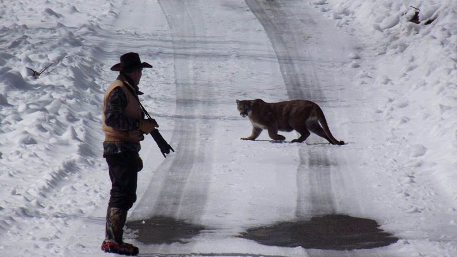 The lion is comming out of the immobilization drugs and does not want to leave the road with the snow piled up on the sides, it's important to monitor the cats until they are fairly well recovered to eleminate any possibility of a wreck happening...