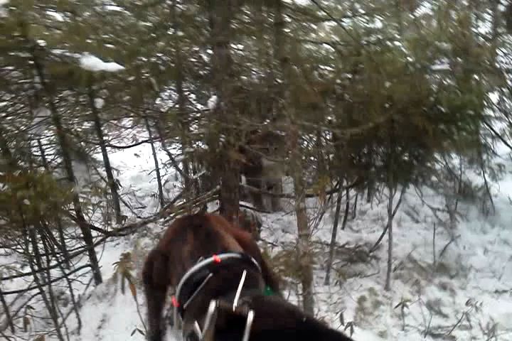Couple of videos from some cats this weekend. About a week ago we had a pretty good crust going but we got probally 6 inches of good stuff on top of that so the snow is really good for catching right now, After the jump most races are lasting maybe 10 min before they screw them down. Still good training for coldtrailing but I like the longer jump races for workin the puppies. The first video is my 5 month old female from this years litter out of Flambeau River Gretchen and Collars Smokey on her first cat. So much fun watchin young dogs light up.