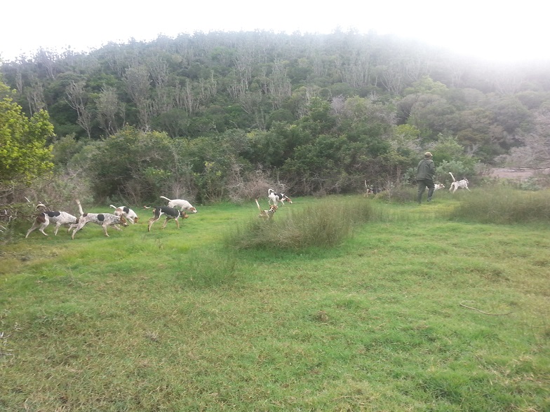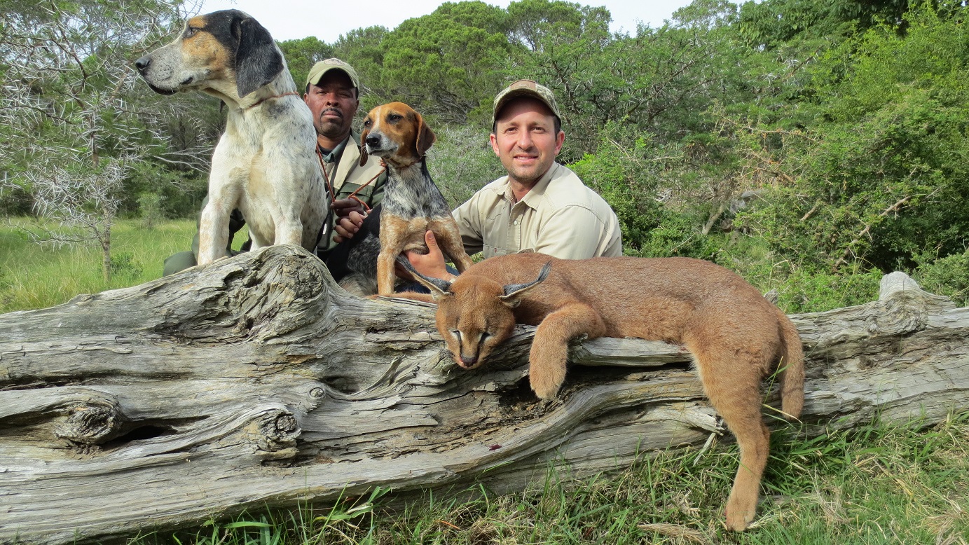 The morning of the hunt Jeff picked me up about 5 am. We headed off to an area that a rancher had seen a caracal in about a week prior. Jeff dropped Tim (the dog handler) and myself off with 11 hounds to start hiking into a canyon to see if the dogs could find any scent while Jeff went to another area to listen for bushbuck barking. The bushbuck will bark (sounds very similar to a hoarse hound) at caracal that are moving through the jungle. Anyways Tim and I started hiking in the dark watching the hounds hunt for scent. About a half mile into our walk the dogs started picking up the scent of a caracal or a jackal, we were not sure what at this point. They started trailing pretty slow and hunting hard at first but shortly got to moving the track very quickly. At this point we decided it must be a Jackal after we had followed the dogs for 3 miles through several drainages. Eventually this jackal crossed a big open farm field and the dogs were having trouble so we managed to get them gathered and Jeff came and picked us up. While we were out chasing the dogs Jeff received a call from a local rancher that one of his hands had heard a bushbuck barking so we decided to head there asap to check it out. Again Tim and I unloaded the hounds and headed off into the canyon where they had said they heard the bushbuck while Jeff went to a high point to listen. When we were about half way down into the canyon we heard a ram bushbuck start to bark across the canyon from us so Tim and I started to pick up the pace to get the dogs there to see if they would hit the trail of the cat. Unfortunately when we were about 3/4 of the way to the bottom of the canyon the hounds started barking and trailing in the opposite direction from where we heard the bushbuck. Tim and I ran as fast as we could and circled below the hounds and got lucky that they trailed into an open field at the bottom of the canyon. At this point we were able to get them gathered and turned around on the trail. Once we got them trailing in the right direction the 11 hounds moved the cat very quickly through the jungle brush. They trailed about a half mile with tim and I going as fast as we could to keep them in ear shot. We both heard the tempo of the dogs change and we knew they had treed the caracal. Tim and I fought our way up through the brush until we could start to see the dogs treeing at a large river euphorbia cactus. Caracal get very nervous when they see a person and often times jump tree very quickly often to their demise by the dogs. So when we got close I spotted the cat looking directly away from us and I took that opportunity to sneak in and get a clear shot with the shotgun (used #1 shot) instead of trying to get live photos in the tree. Made a good clean shot and the cat got hung up in the tree so the dogs were able to keep treeing with out tearing up the caracal. It was an awesome hunt and I highly recommend Jeff Ford if any of you get the chance to go hunt one of these cats.