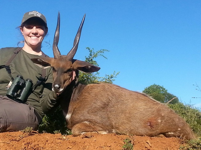Here is what a cape bushbuck looks like. My wife killed this nice ram on the last afternoon of our trip. We got lucky and the weather was very cool on the coast so the bushbuck came out in the middle of the day to sun themselves. Normally they are very nocturnal and you only find them on the edge of the brush very early morning and very late evening. This is the critter that barks at those cats.