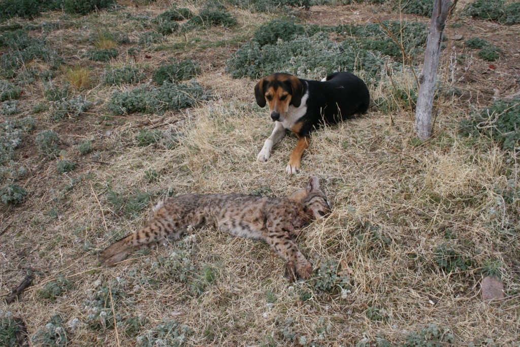 The bobcat was hidden in the brances so I had to get it to move tossing sticks at it didn't work so called the dogs back sat up hill from it where I could see I could see it start to climb back down. As soon as it started to move I let the dogs run back down to the tree.