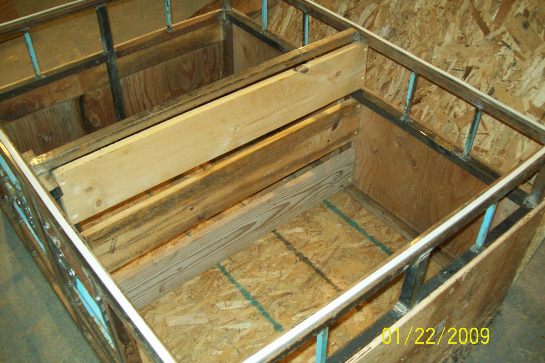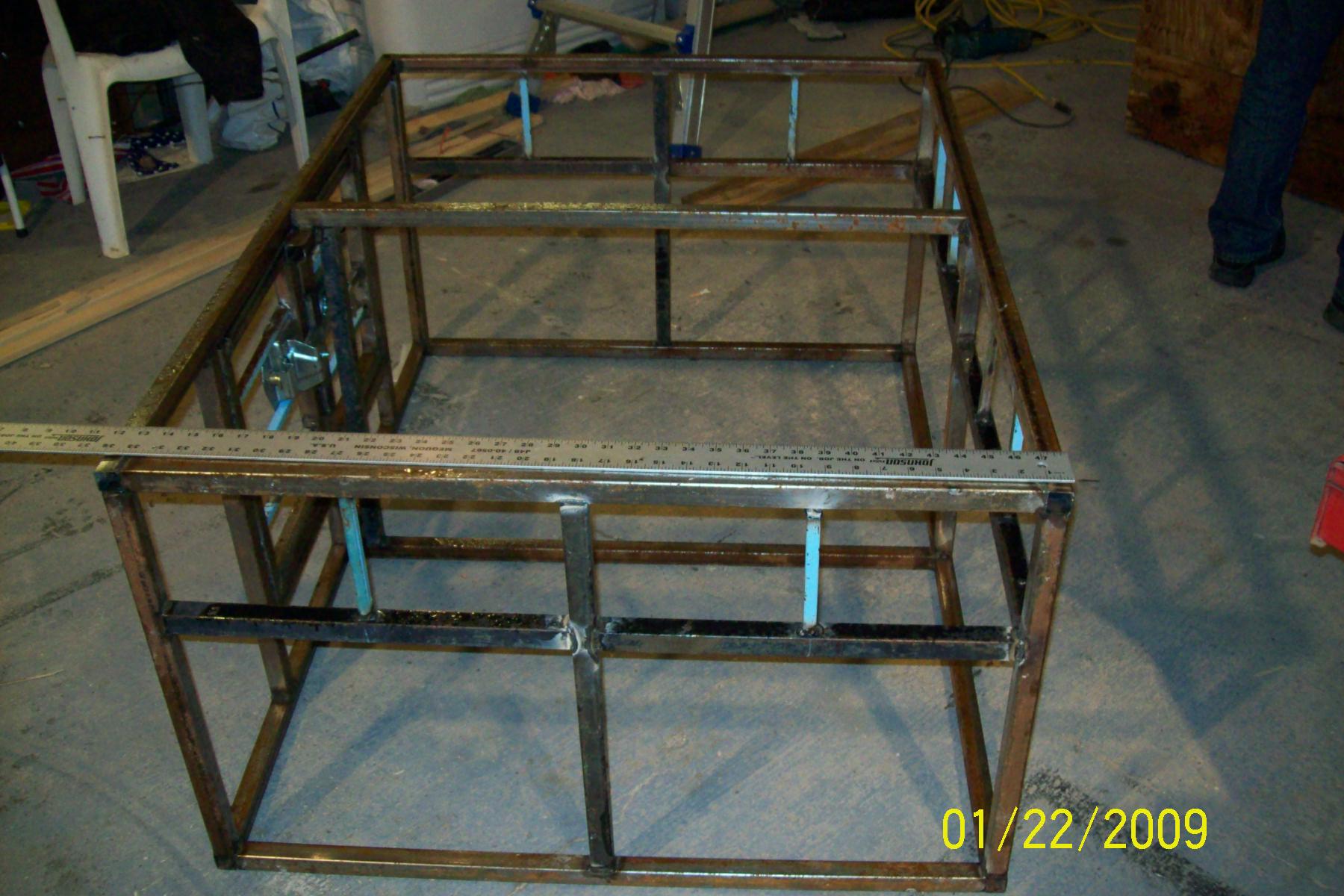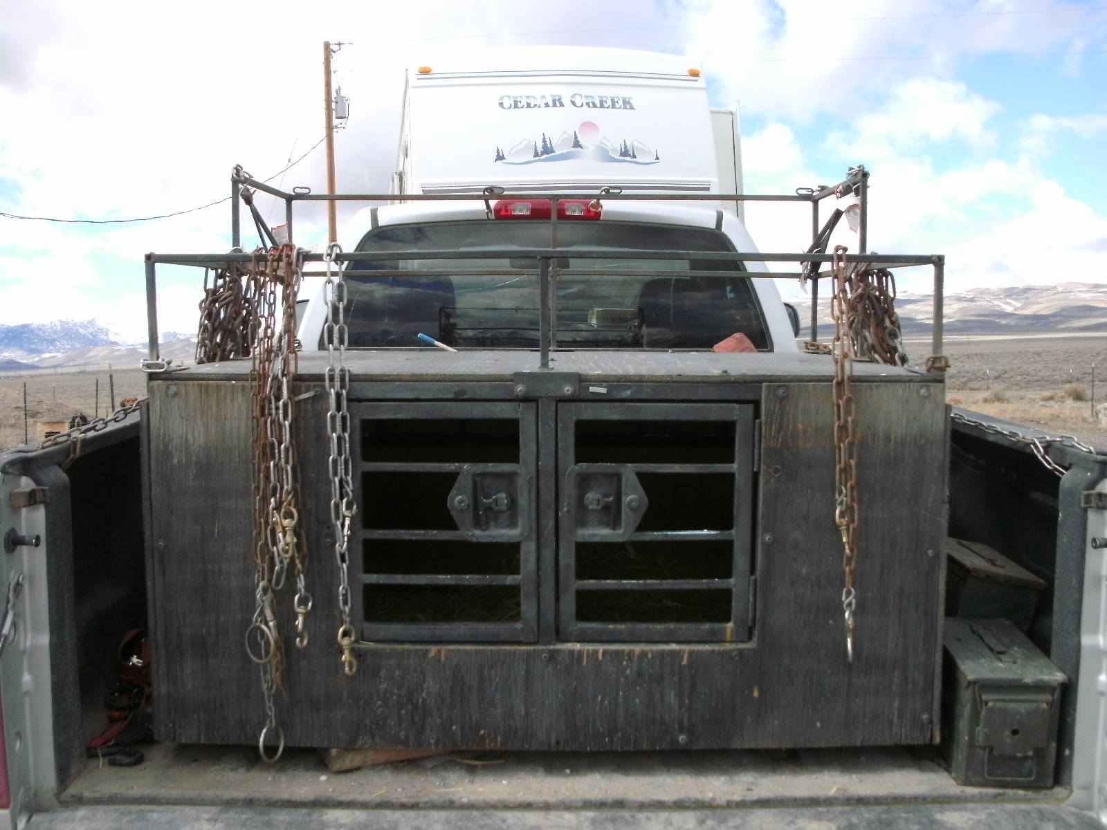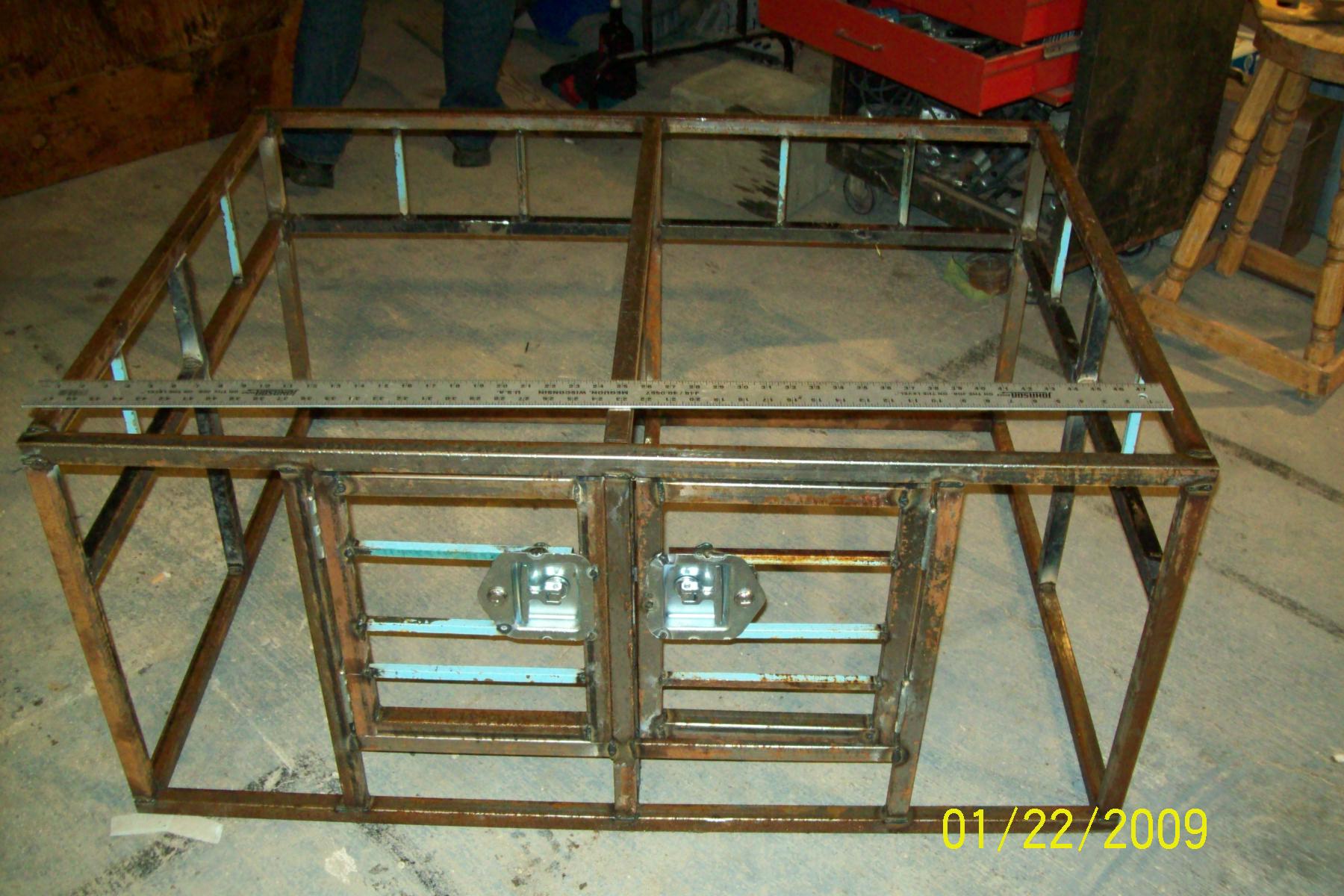 I made this dog box a little over a year ago. I have since repainted the frame, and repaced the plywood. This spring when it warms up a little bit, it will get a new coat of paint that is a light green. It is just primed right now, which has worked fine for the winter. The top 6" of the box on the sides and back are removable to air/rigging holes. I also built the upper part as a removable rig/utility rail. It works good for holding my tire chains. I have about 100 feet of 1" by 1/16" square tubing and probably 40 feet of 1/2" square tubing in the set-up. I used locking t-latches for the doors, and had to put one more vertical piece inside in order to allow room for the latches, plus attach a piece of strap for the latches to catch on. The total size of the box is 3x4' by 22" tall. I have it attached to the truck using two turnbuckles. I can fit my 4 dogs comfortably in the box. Two of them are about 65 lbs. The other are about 50 and 40 lbs.