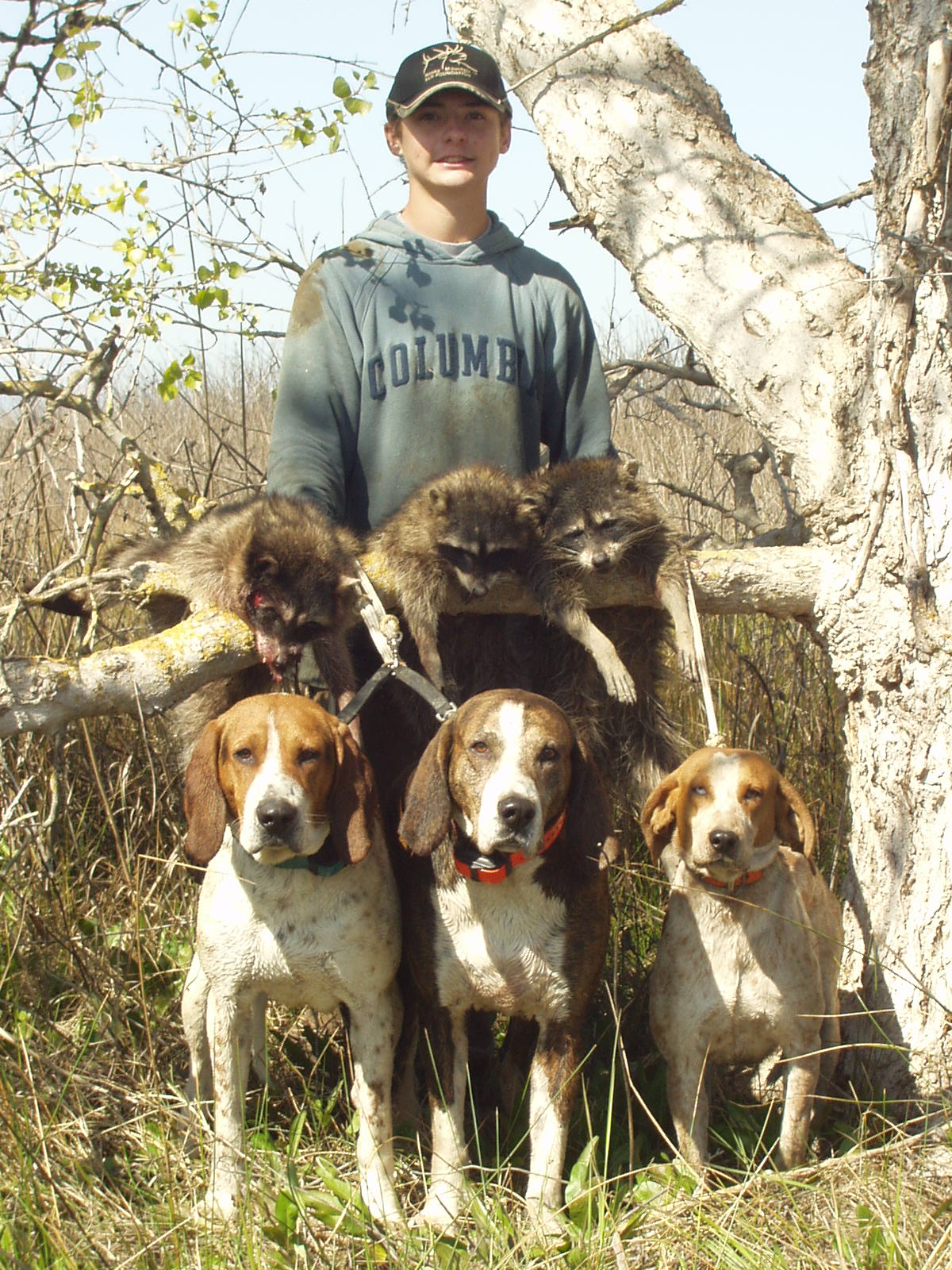 I treed three today in a hollow maple they were down inside so i started hiting the tree with a stick and they came out and went to the top, and no sooner did the one get to the top it bail and the fight was on . while in the meantime one of the other one jump from about fifteen feet and dam near on top of me and then the next one jumped . I haven't seen to many coons jump like that that from that far up. any way to get back to the daylight thing i like to hunt during the day cause i am a girl and i hunt by myself when my boyfriend is a work during the day, we also hunt a night you get to see who's doing what and how good of a cold trail dog do you really have . or will they take the right end. anyway happy huntin.