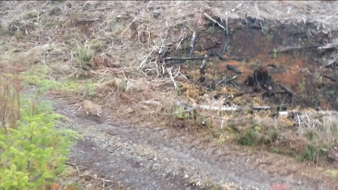 We had to drive several miles around to get above them but we beat them to the road on top.My buddy went out a side road while i stayed above them .Watching the Garmin i stopped where they were about to cross and the cat came running out in the road.She might have weighed 12 to 15 lbs.She immediately went into a slow,slow,slow walk.She walked up the edge of the road