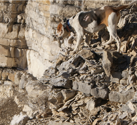 I was lucky to see this one. .. I had turned out the dogs on a north facing slope in about 4 in. of snow and a very good track. They ran him up over the first ridge and then the classic bobcat tricks began in the dry. Lucky for me they had him jumped. Two hours later I was sitting at the truck thinking the cat had snuck through the ledge. I was trying to call them down with no luck so I broke out the binoculars. After glassing for about 10 min. I finally saw Mr. Bobcat tucked away on a shelf halfway down the ledge with nowhere to go.