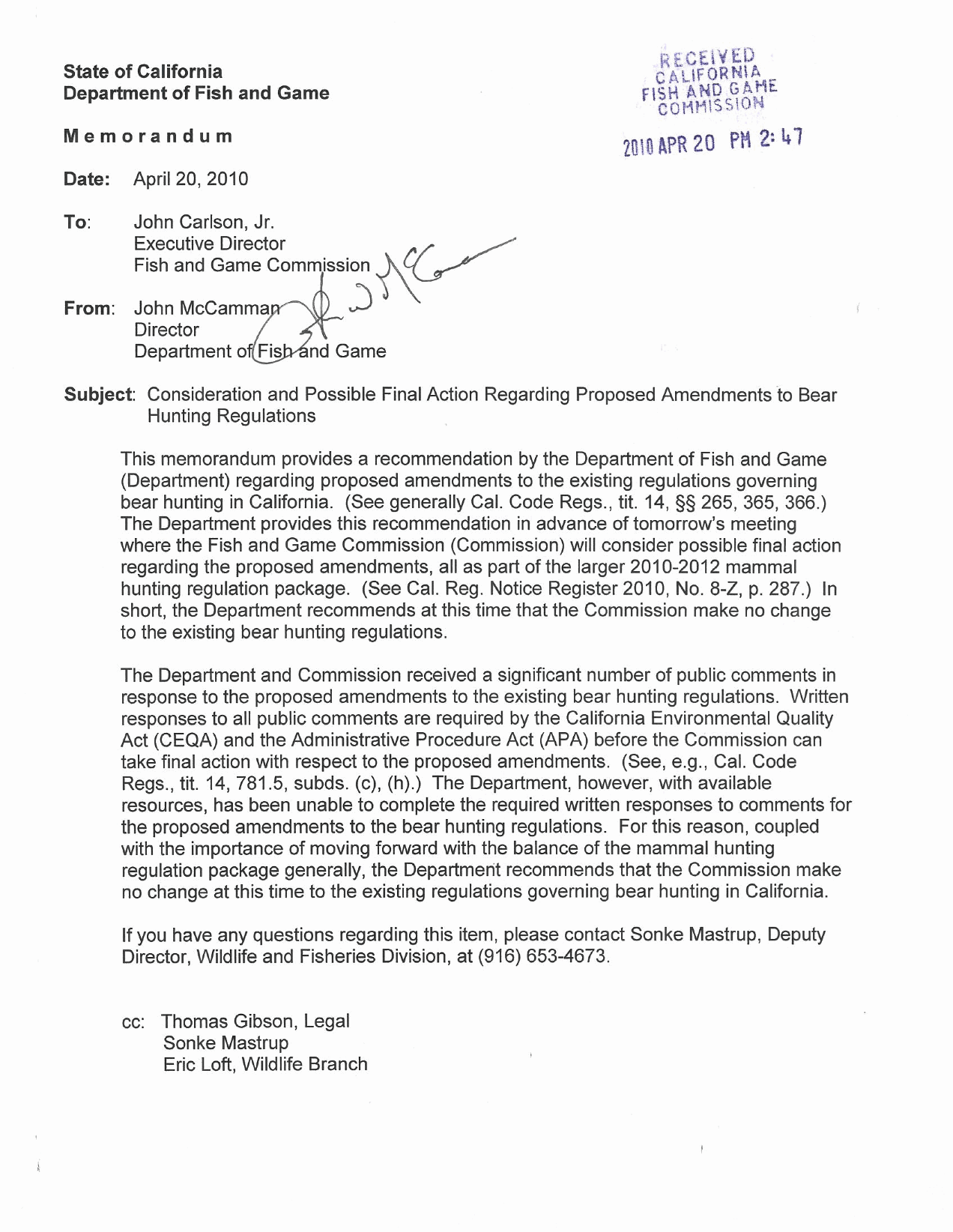 Re: California Fish and Game Commission to Decide on Bear Issues
