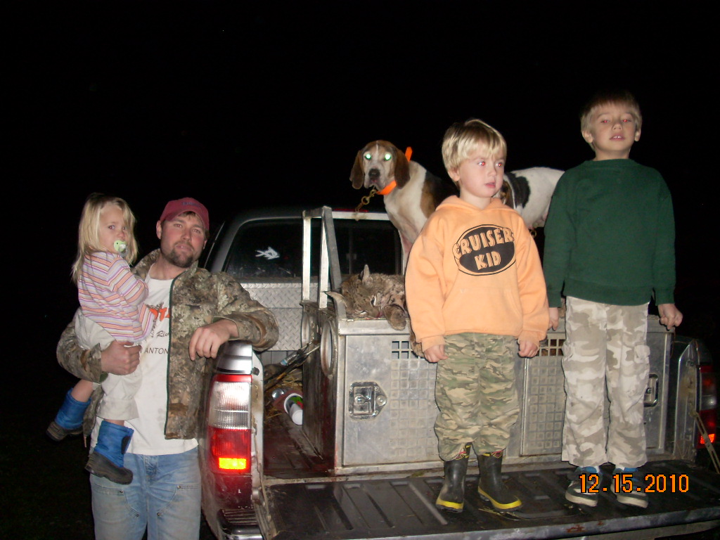 Well..thankyou very much for the introduction. And the respect goes both ways, you and your dad are top notch Houndsmen in my book. I have wanted to post more, to give the other hound hunters out there a feel for who I am, But most of my spare time has been spent in the mountains chasing Mr. Illusive. I was thinking about loyd the other nite. I probably went out catdogging with him a half dozen times or so, and I bet I only really said a few words to him. He would talk and I would listen. I sure wish he was still alive because I now have a list of questions longer than a roll of toilet paper. My old Talker dog is doing very well, He works great with that 15 m femail(she will make a fine cat dog) she has seemed to bring a little more life out of the old guy. I put in my journal that he is the best 'locate' tree dog I have ever had. At times he just makes it look so easy, whenever I start to doubt him because of his age I get proved wrong. He'll be missed when he's gone. For sure I would like to see many pups out of him, the femails should come in here soon I would think. Here is a pic of a cat the kids and I got awile back. We actually tree'd 2 that evening but I only took 1. Two nites ago I got 1 with the kids again, I had 3 dogs down when they started(roading the old dog and the 2- 15m old pups) I was a little nervous so I jumped out to look for a track and ease my mind. The only thing I told the kids was be quiet and dont honk the horn, I should have known better than to ever mention the horn. Before those young dogs really got moving, sister layed on the horn calling out the young male, he missed the race because of it. All my fault it's funny now. Anyway thanks for the kind words, I'll do my best to keep em honest while your @ work. Also to everyone else thankyou for the use of your site. I have noticed advice to young hunters that is great and valueable for their progression(and mine) in the sport. Thanks again J.W