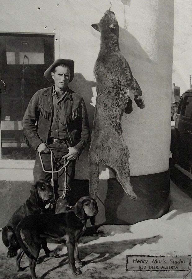 The fella with the lion and hounds is the late Clarence "Cougar" Long a well known lion hunter from Caroline Alberta, this photo was taken in the late 40's when a soda was less than a nickle....