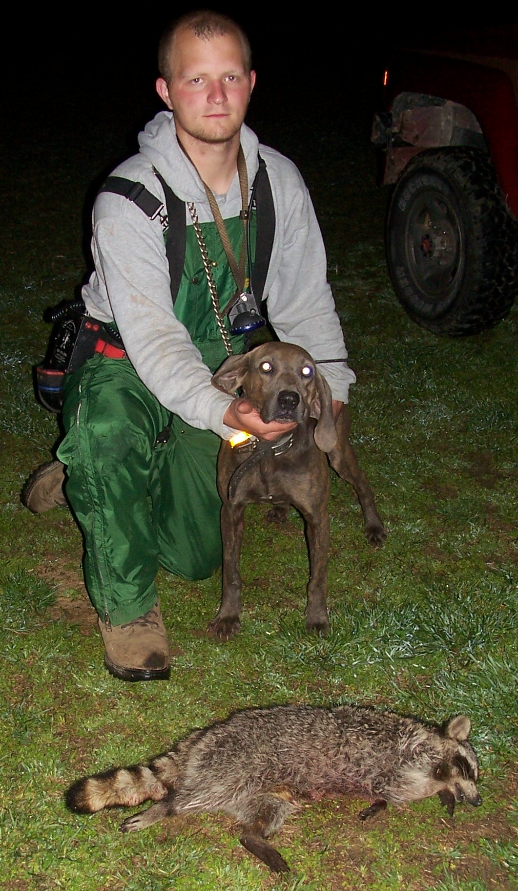 Went tonite to a place I have hunted since I was a teenager, about 7 out of 10 trips in this perticular place ends up in rock bluffs where it's severly infested with Smoky Mountain Ivy Thickets, rocky steep country, well long story short, I had me & Shane Flamino's Doc dog ( a very young Gene Walker pup) & my old Kemmer Coon Dog Julie, Doc opened & headed strait for the bluffs as usual, about the time he got to where the garmin shows the bluffs & many a hole the race stops, but the dogs are not on there way back, after a couple minutes the garmin still shows them in the bluffs but I can't hear them & there only like 700 yards in there, we start to them & I hear a fight & when we get to the Dog has caught & killed this old boar coon he weighed 14 pounds 14 ounces & is missing some teeth, his back foot is as long as my middle finger & he has 8 black rings on his tail ( most I have ever seen). I would be safe in saying this old boy has ran from my dogs a hundred miles through the years, as I have ran him for several years a couple times a week but the speed of ole Doc was the end of him, he was full from eatin' out of a creep feeder my Pa has out for the calves & was a little slow tonite & he wasn't liking the outcome to much. Thanks Gene Walker for breeding dogs with the kind of track speed that is not seen very much in the plott breed. I sure am liking ole Pocahontas Doc.....