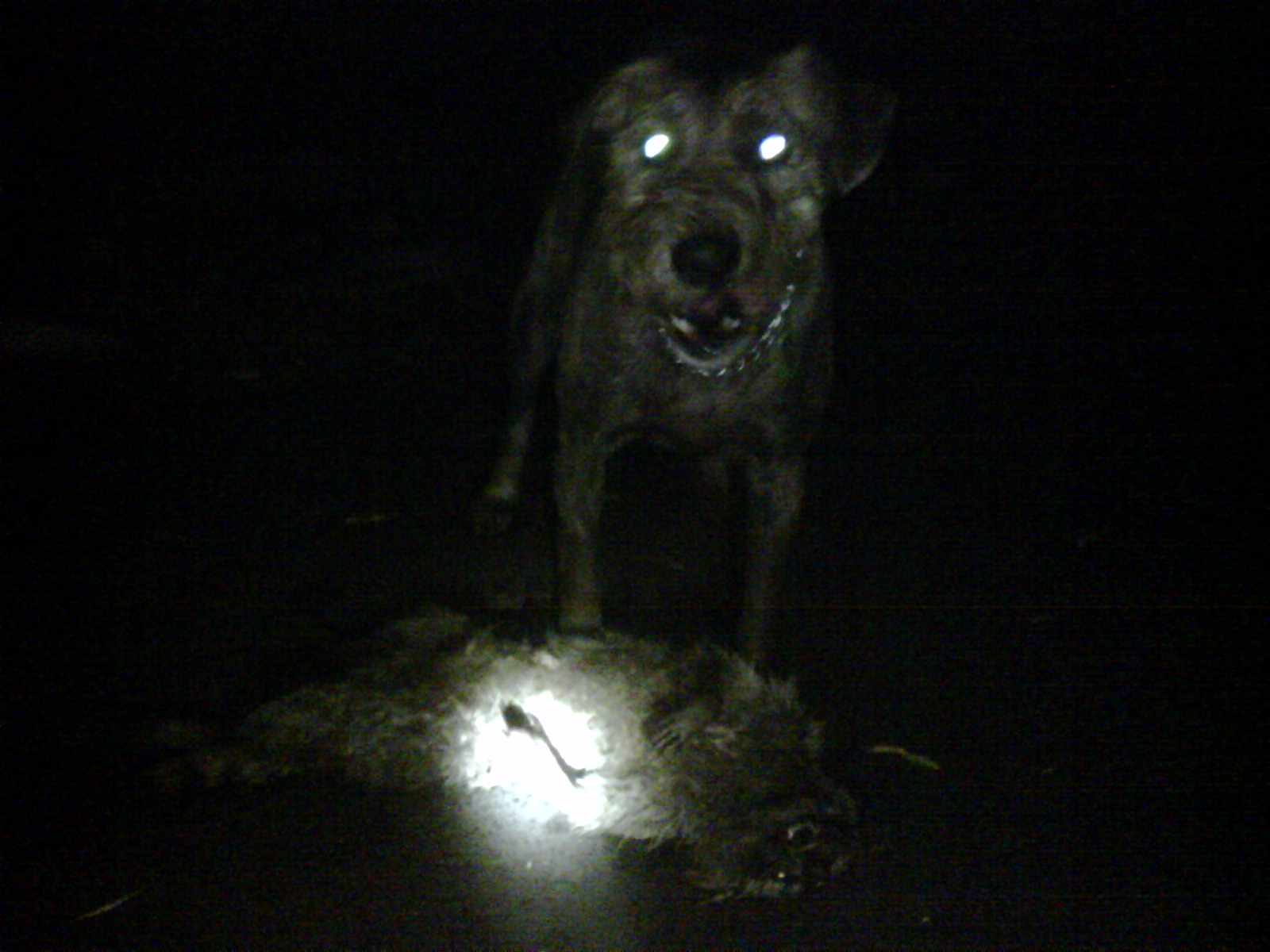 This is a picture of Bowser, my akita/schnauzer mix standing over a coon. The picture sucks but its the best I have for now. Ill see if I can't get a better one on.