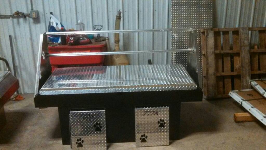 The small truck combo boxes that I've seen are really only big enough for 2 small / med. dogs and only 1 compartment. This set up does work well...Storage for the stinky stuff and tools, and you always have a dog box in.