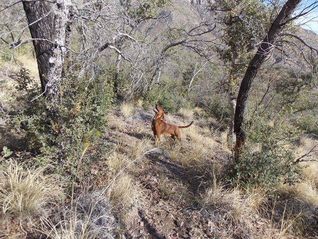 He is not wearing a collar because I was worried that if it swelled again it could cause trouble. If you look close you should be able to make out the bare patch where I shaved off his fur around the drainage point. I didn't take him hunting on purpose but had tried to lay him up while he was healing... dumb lion came past the orchard and Red went over a 6 foot fence, ran and treed the lion about a mile away solo.