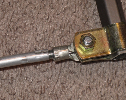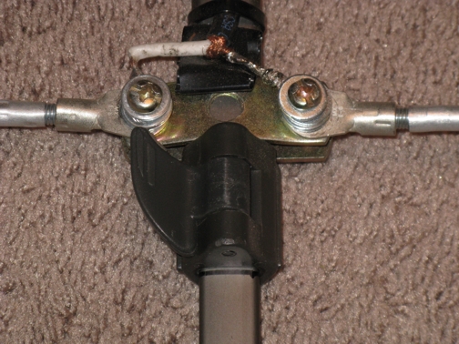 Now how to make those darn elements bend so I don't get caught in the brush or bend them while walking. I used aluminum tube elements and I was able to find a spring that fit inside of it and the ring wire connectors. Then I simply, lightly, crimped down on the element over the spring, and the wire end of the ring connector. Bingo, now I had flexible, folding elements. Then I simply used some washers to attach them to the bolts on either side of the saddle valves.
