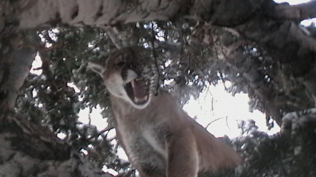 He called me at 6am and said that he cut a snowed in track. He went home, went to church, ate lunch. By 1pm he decided the lion had a good enough head start and kicked a few culls out to see what would happen. Nada peep......trailed the track into the bears head and then they started to make some music. A long hike later and there was a runt of a tom in a tree. He did have a few battle scars on his nose that made him look cool.