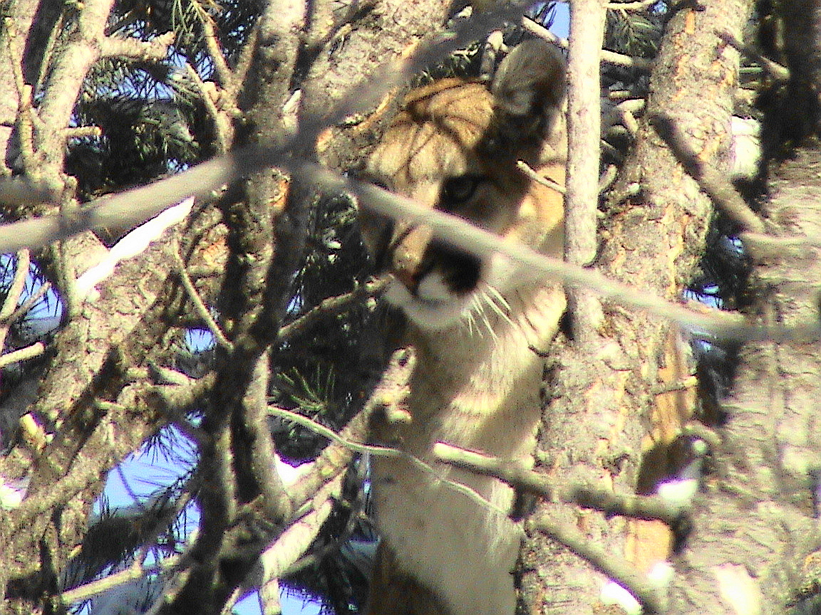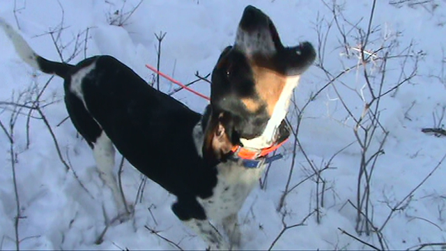...off we went. The track was a little blown in at that time and moving was slower than usual but, it didn't go far and treed they came. here a couple picks... bad tree but very fun hunt with some good guys. If I just had one of Big"R" falling some distance out of a slippery tree clinging for dear life