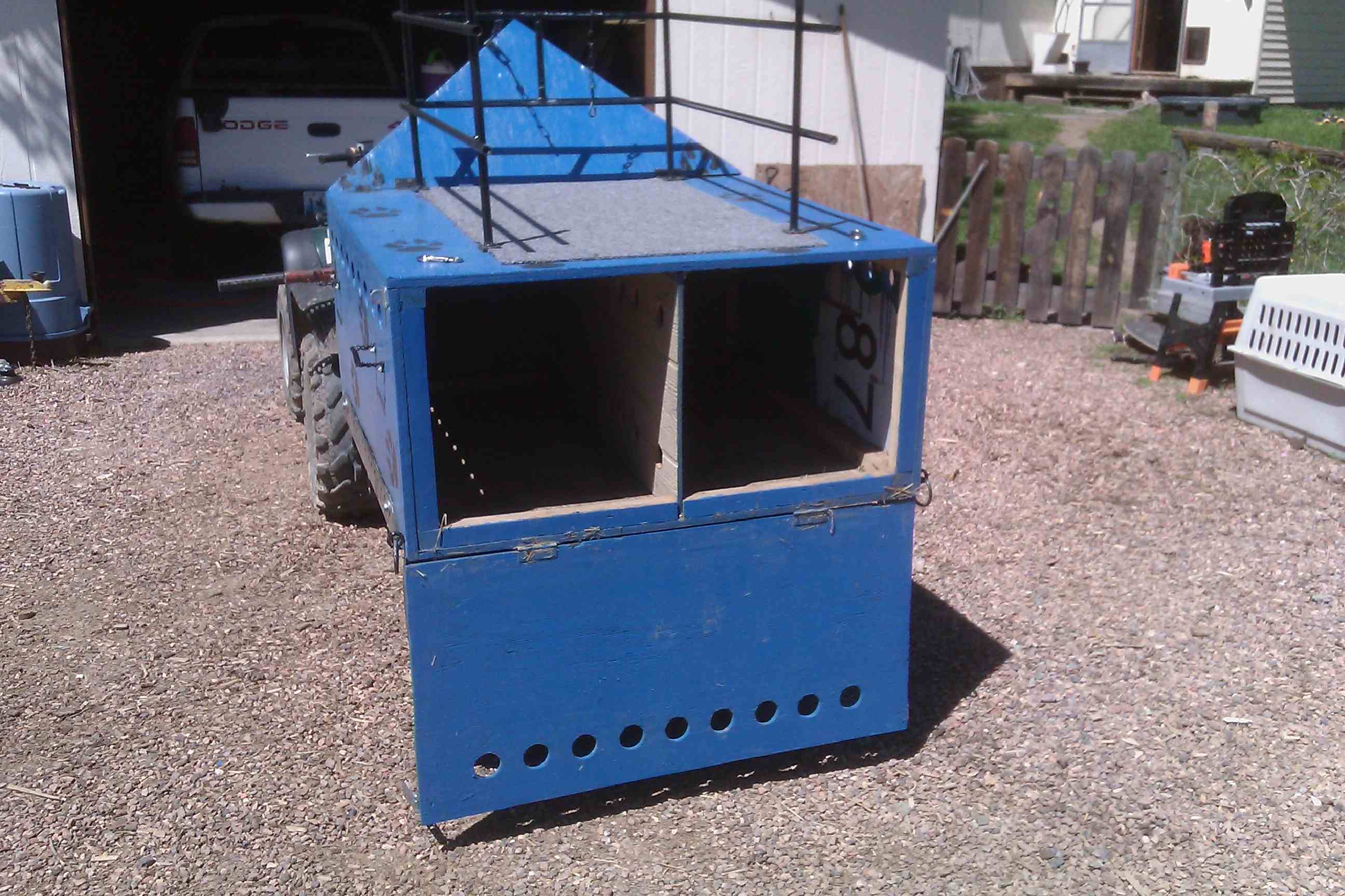I just wanted to share my new dog box with you. First off I got an old blown up Kawasaki 220 ATV. I then chopped it in half and put a tongue and 2" ball on it. I then welded a couple of brackets to it so I could mount an aluminum base. The aluminum base is where i mount my box to. I also wired in a brake light for night time driving. Then I built the box out of 3/4" ply wood, I used old highway signs. The box is large enough to hold 4 dogs. There is a removable divider in it to separate the dogs if need be. The front point of the box is the storage compartment where a guy can put your hunting gear. The rack on top is made of 1/2" conduit and is large enough for two dogs. The mat is a porous woven rubber that is great for traction. The box can be easily removed by taking out 4 bolts, then it can be put in your truck for hunts father away from home. The box is not to heavy, just awkward. I can take it on and off the trailer to my truck by myself by pulling up to my tailgate and sliding it in or out. But another set of hands makes it easy. I have been using the trailer for a few months now and it pulls easy and is very stable, even better loaded with the dogs. Thanks for looking.