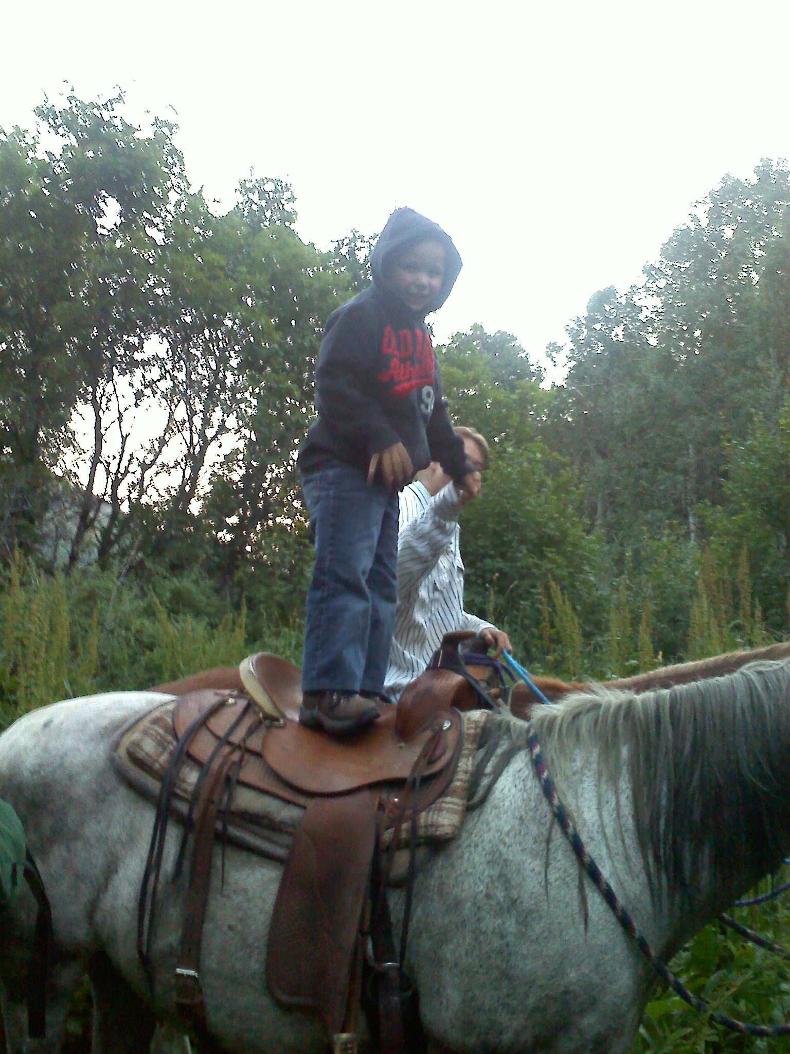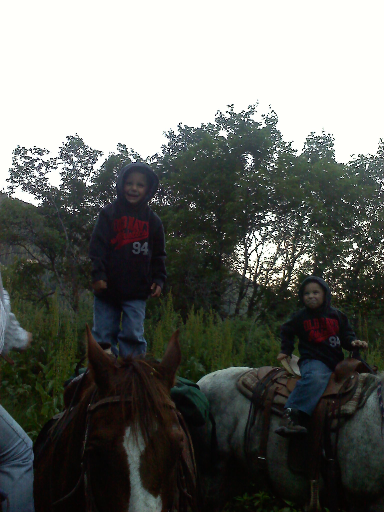 Took my boys out for a little ride today 3 & 5 years old. Its a proud moment for a dad the first time they ride their own horses by themselves with no help. We didn't end up getting of the mountain til 11:30 @ night and they did great. Good thing their mom was out of town or she would've been pissed! We got about half way up & stopped to rest the ponies & I turned around and the3 year old was standing on his saddle so I made the other one do it so I could post a couple pics for Jason haha.