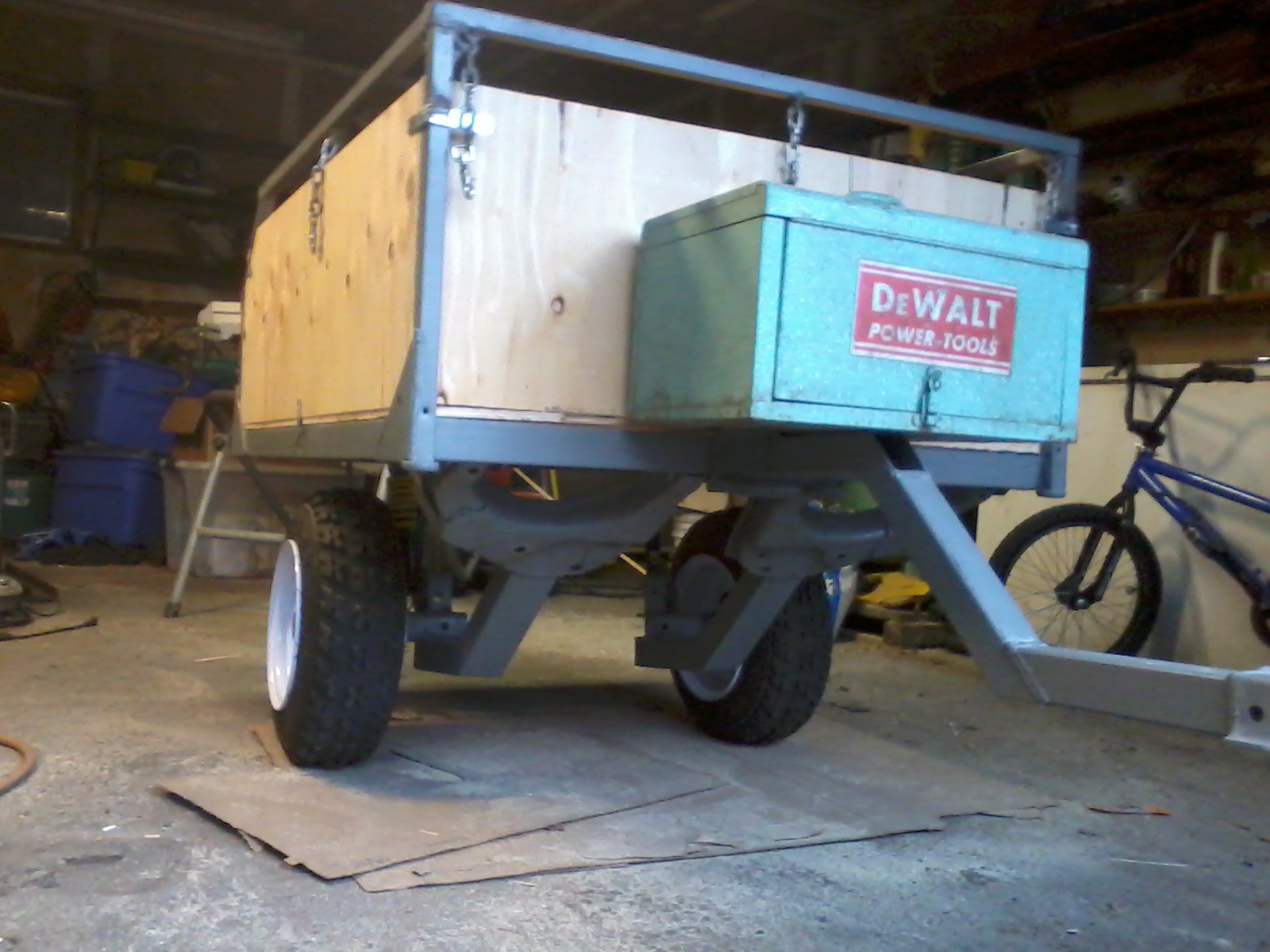 I have made one and it looks a lot like yours but it was made of 3/4" plywood. I used an old 4 wheeler axle. it works well but after using it for a year i found it to be top heavy. On flat ground its great but on side hills it wants to tip over. If I could go back and start again I would put the tires out on the sides of the box and keep the box as close to the ground as possible. Its looks like you may run into the same thing i did. Other than that it looks great. Not tring to put it down but just giving my input. Good luck, let us see the end product. You can see the one i built on here its under kennels and dog boxes "My new atv trailer/truck box" if i remember right. Mine might be a little taller not sure.
