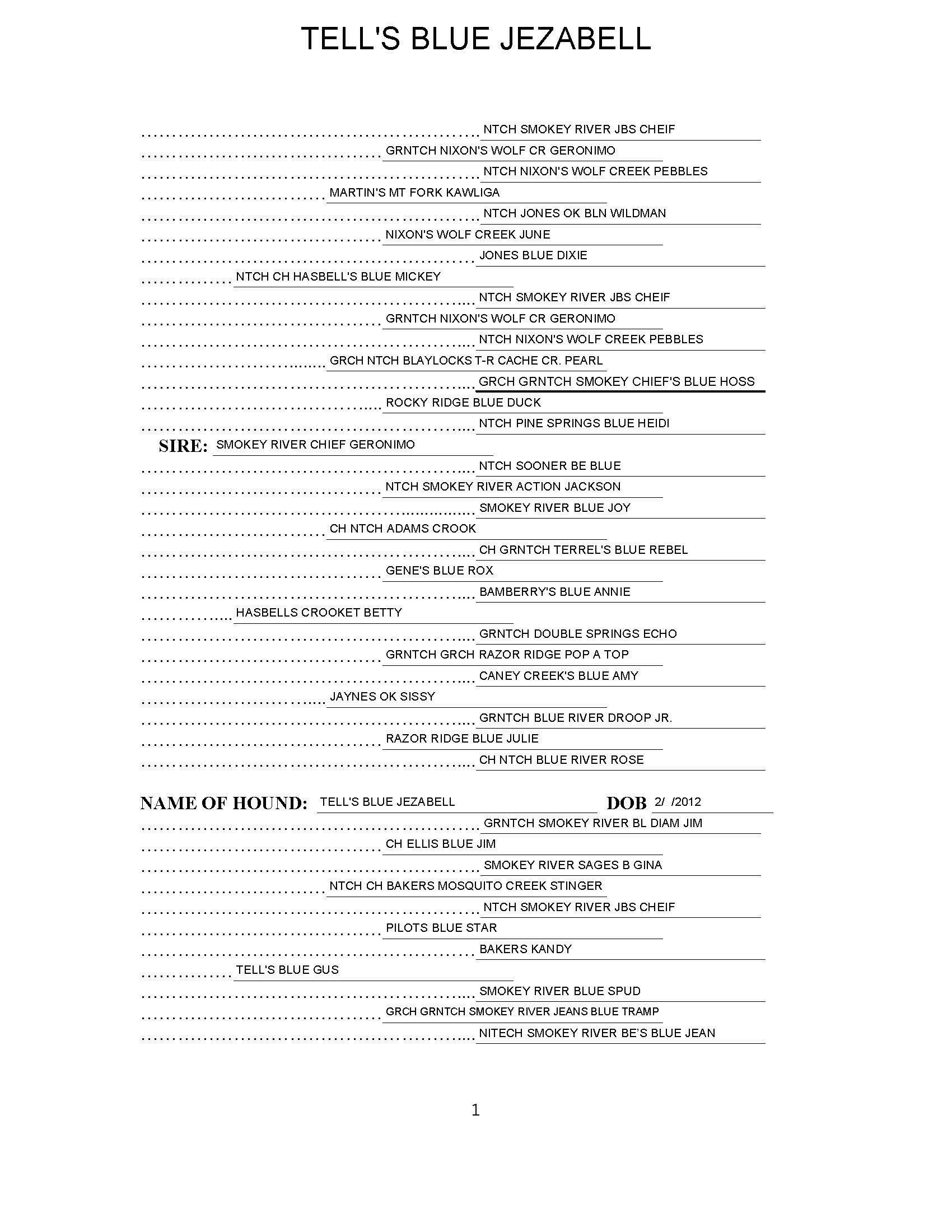 Tell's Blue Jezabell is comin to TN. She is heavy Smokey River bloodline bred and her Sire is Smokey River Chief Geronimo and the Dam is Pendergrass' Blue Fancy. She is my newest addition and proud to own her. Thanks to Glynn Holmes.