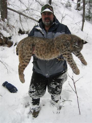 Here is a 33.5 pounder We caught a few years back. This was one of those races that left us scratching our heads. There was a bait and trap in this draw at the upper end of a culvert. There were bobcat tracks everywhere. We thought we had the front end figured out when we let Roy and Penny go. Roy peeled off the track we put him on. I thought he was running it back wards. He messed up the track he was running, but I know the cat had walked to the bait on this trail. He must have went back out the same way after the snow had froze harder. Just before they topped the ridge they cranked a 180 and started boiling back towards us. About 600 yards ubove us they locked down. It was in averiticle blowdown chocked crack that was slicker than whale snot on ice. It took me about 45 minutes to get there. When I finally did arrive Mike was smiling big and pointing up. It must have took me 10 minutes to clear my eyes from sweat catch my breath. Mike said I could shoot this one, his words were " you earned it". I'm pretty fat you know. Ha! I will remember this one until alheimers kick in.