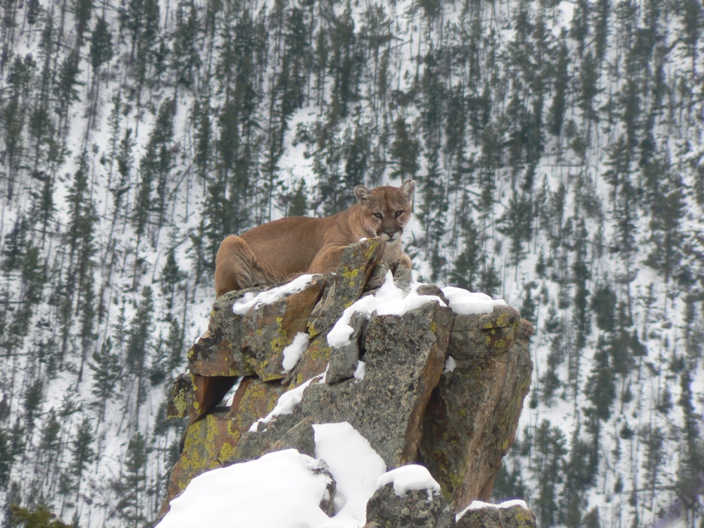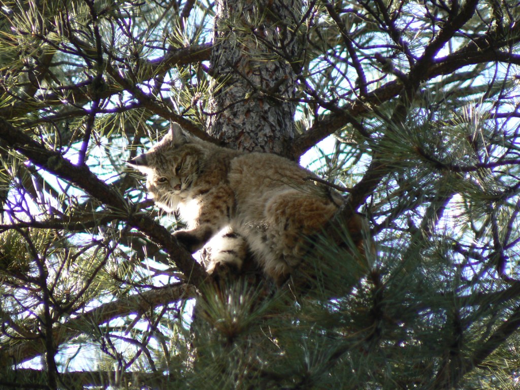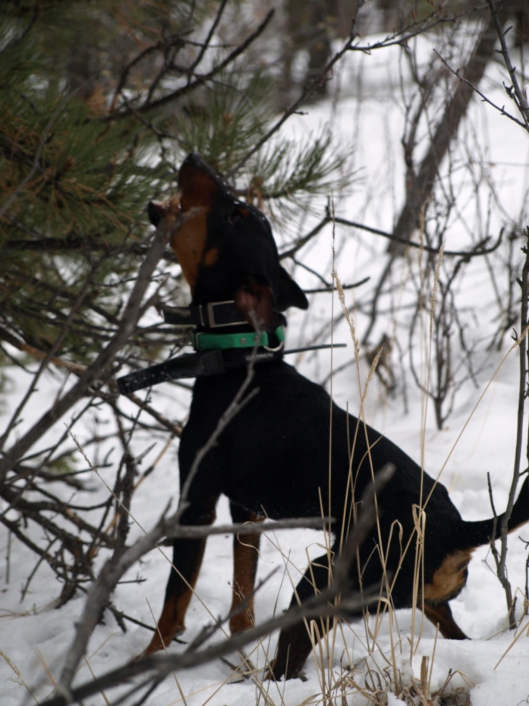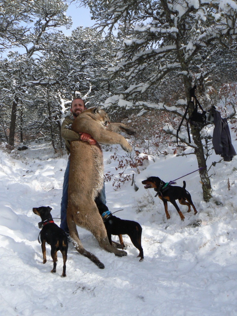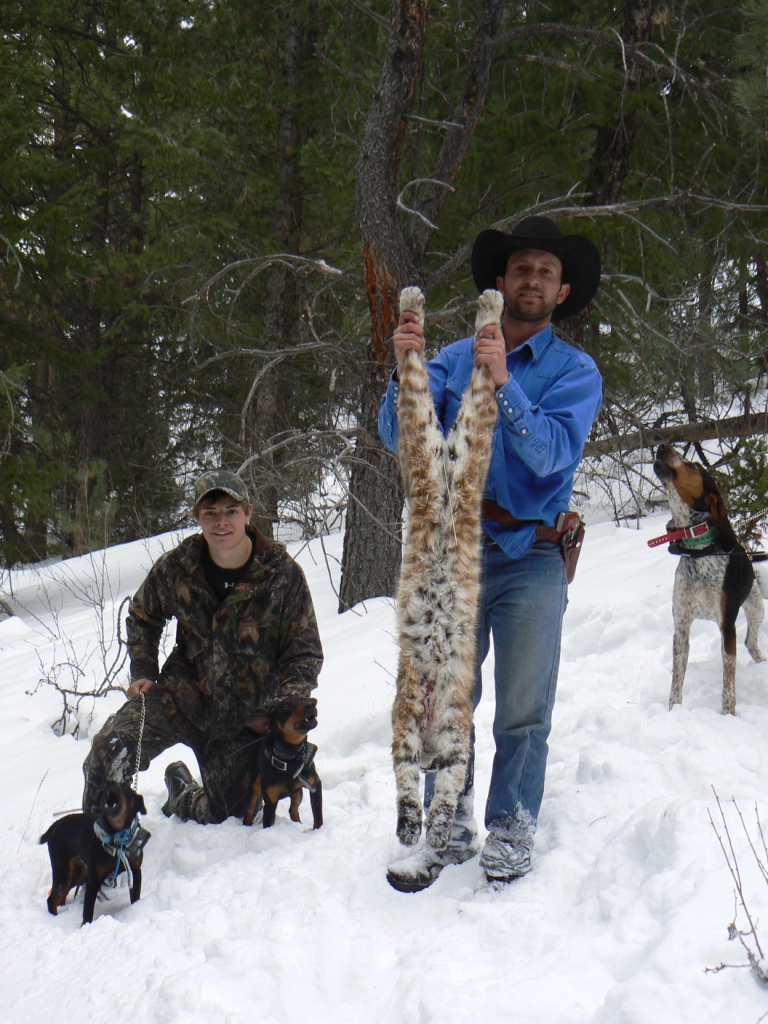 Didn't get any pics of the dogs on this particular cat. The dogs were in the avalanche shoot behind where the cat was bluffed. There was no way a dog could get up on that pinnacle, hell I was suprised the cat got up in that spot. Shortly after that cat spotted us he got up to bail so I had my friend shoot quickly. The shot looked good but you could tell there was a fight going on down below after the cat fell. By the time I got to the dogs the cat was pretty well dead, but I could see one dog suffered a bite that fractured his skull into his sinus cavity above his eye. Anyways here is a couple pics of the Jagds on a different tree