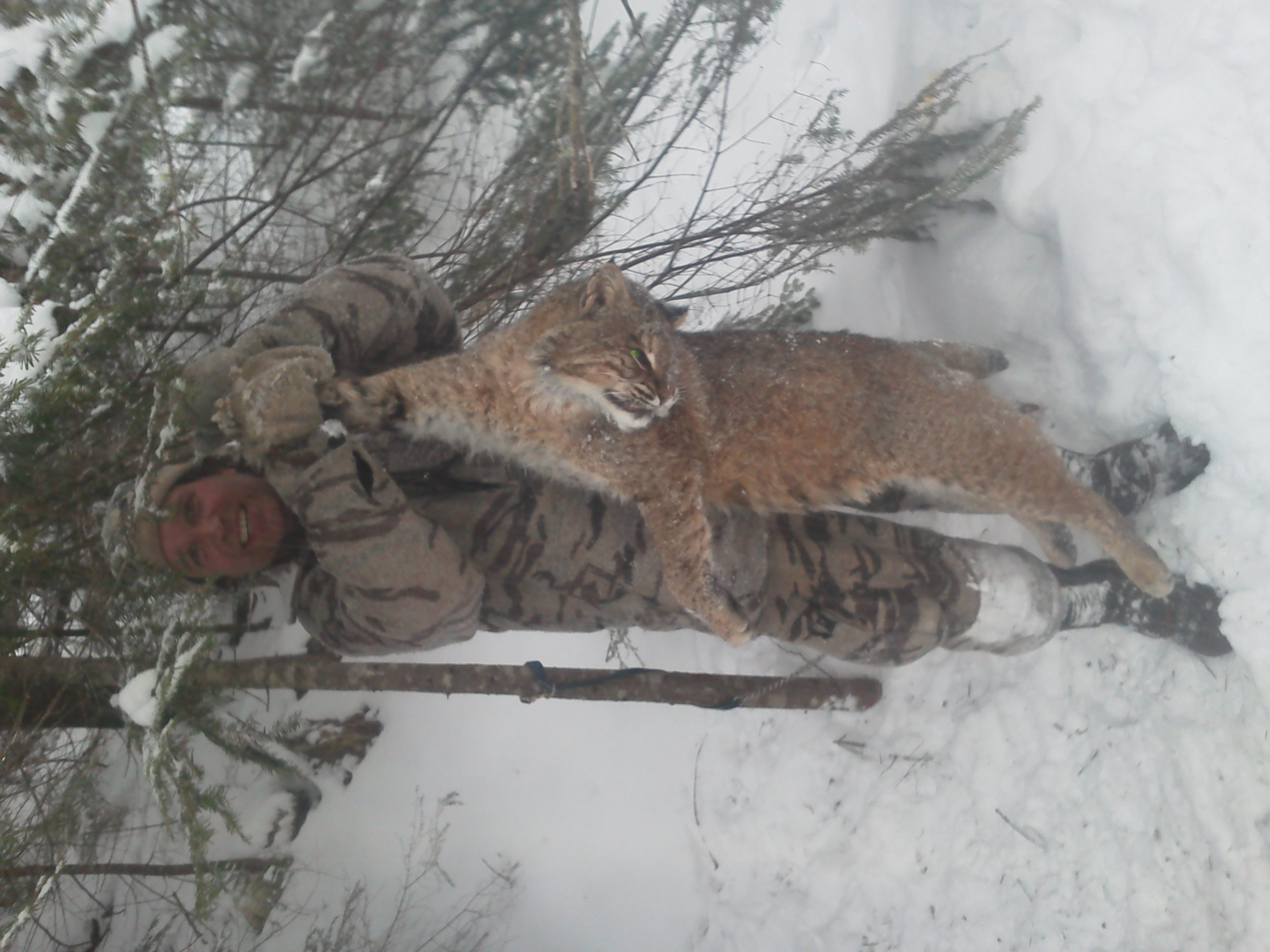 Here a little reading for your eyes. My last cat of the year went like this. I started the day out with Drum my cat dog and a young red dog buck. Riding along checking tracks like a mad man down one rd nothing off to the next one we go we pull in and I see that it is plowed which is normal for the people to get into there camps. as I get to the first turn I see its not plowed go down the road 75 yards cut a nice big tom cat track from last night. So I grab Drum out and put him down off he goes so I go back where I just came from and he makes a lost after about 250 yards. This time the cat had walked into a deer trail and stayed in it for 30 yards or so. I got drum back on to it and off he went southwest after a road and the snowmobile trail he come out to the next road made another lost at the road he went right when he should have went left so I get him back on it and off he goes right towards a house that feeds deer and route 27 so I go over there and ask the people permission to go on there land and see what he is doing and again another lost in a deer yard back to searching again this happened again about an hour later 600 yards down the river. so at this time im 2.5 miles from the truck with no gun no radio no cell phone just me and a young dog. so I go back to the truck and see that my partner Timmy called so I called him back and he said he was in the area and had drums brother jack with him and actually drove right by me so I told him where I was and that it was a nice big cat and that I was coming back over to figure out where it went and to cut back on to it. So we met up by where the final lost was made and what we found was amazing we was less then 75 yards from a persons house and see where the cat had a deer kill. You could actually see the deer kill from the houses kitchen sink. So I go with drum and figure everything back out and off he goes back to the river so I head down the river to cut drum off and give timmy a chance to get back with jack so we can really hammer it out. so when timmy gets there off they go they made a lost again on the road about 800 yards out and that was the last lost they made 3/4 of a mile later they had the cat caught and bayed up against a steep banking as we walked in the cat ran off 10 yards turned around and came right back the way he came from and that is when we humanly harvested this Nice 38 lb beauty.
