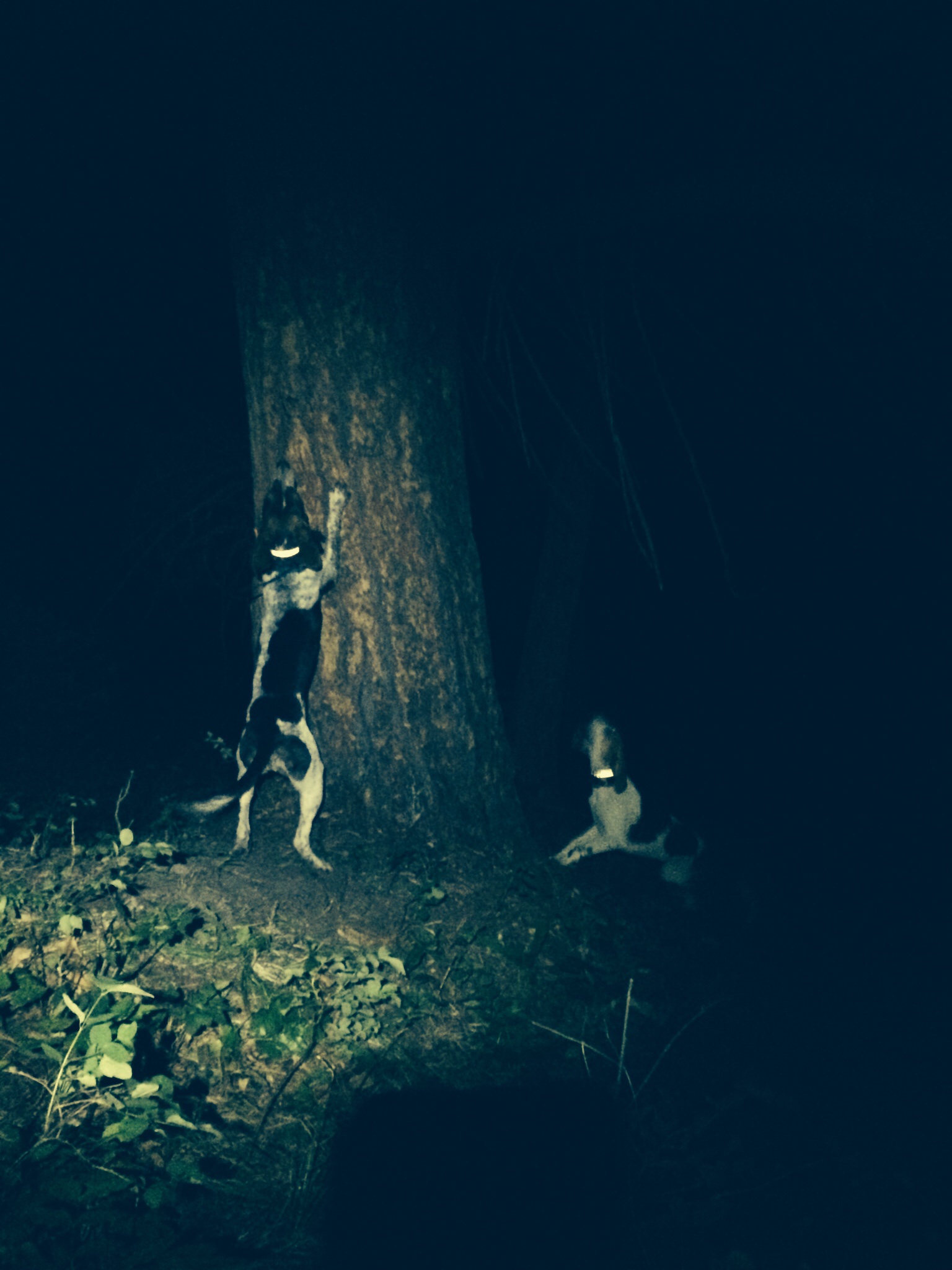 The one on the tree is 1/2 walker, 1/4 Plott, 1/4 bluetick. At 8 months she is an incredible dog. I would make the cross again but both of her parents are dead. I don't know what the breeding is on the Plott and bluetick side. She is a great granddaughter of Loose Bruce on the walker side.