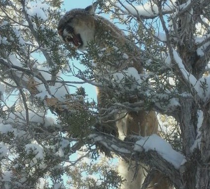 the female cat in the quakie tree was a fun one watched the whole race cat thought it was tricky jumping off rock bluffs but dogs were able to figure it out and got her treed. The tree in climbed had old tree stand pegs in it lol kinda funny never had that happen.