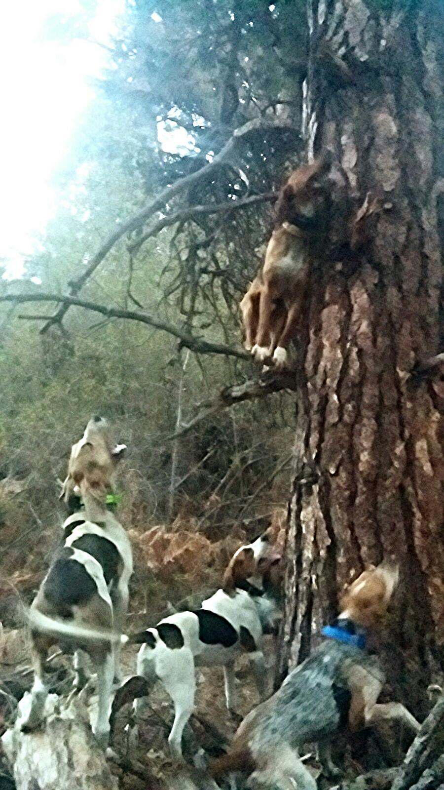 Good run today. Ran this guy in some pretty open country outside the creek he was in. Sat up on the hill and watched some dog work and a half. Once he got out of the running mood the dogs walked him up to a big pine where he expired. Satisfied with the dogs!